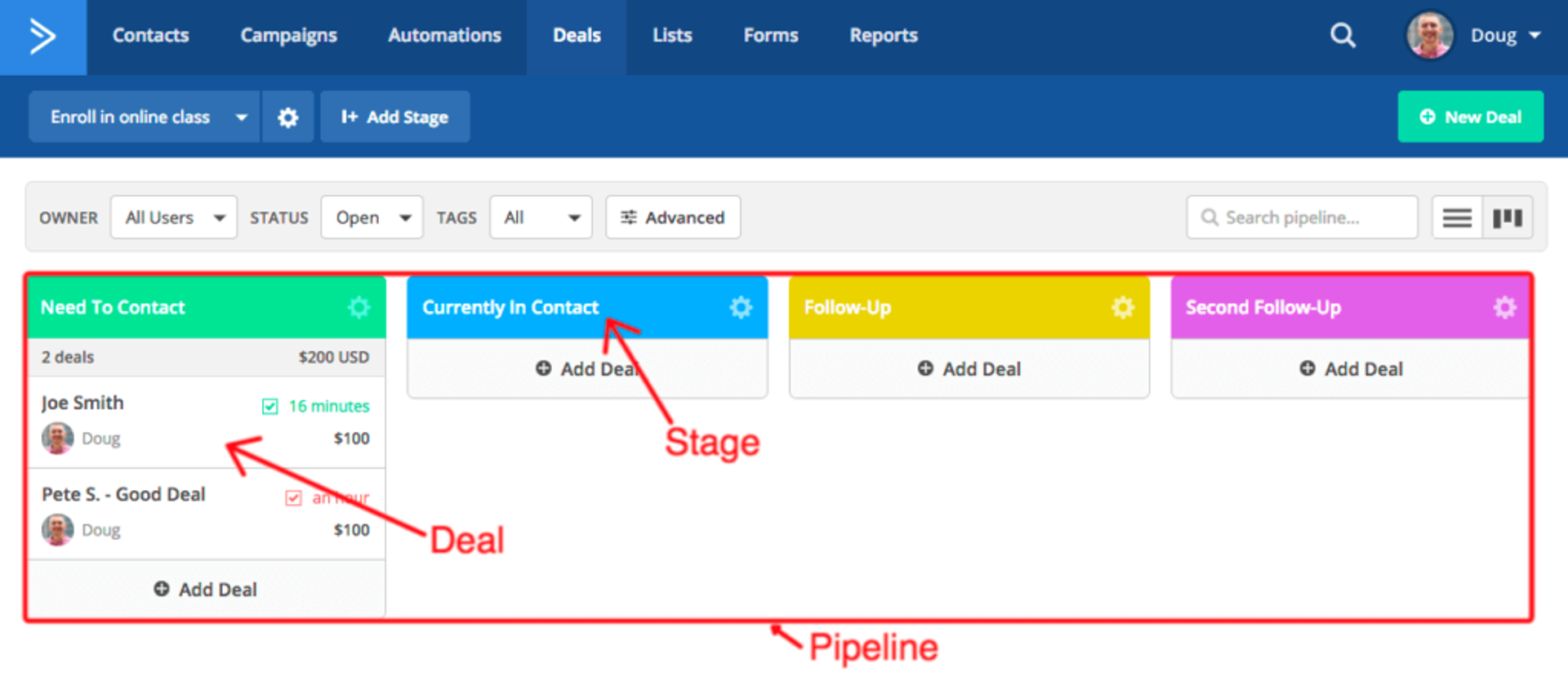 Ad esempio, potresti far entrare tutti i nuovi lead in una fase di "necessità di contatto" per indicare che nessun rappresentante di vendita li ha ancora sollecitati.