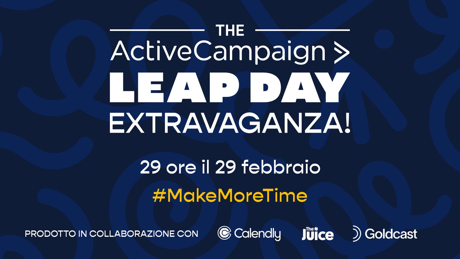 Così è nata l'idea per The ActiveCampaign Leap Day Extravaganza!. Ma non si tratta di una normale conferenza utenti: realizzata in collaborazione con Calendly, Goldcast e The Juice, il Leap Day Extravaganza di ActiveCampaign aiuterà gli esperti di marketing e gli imprenditori di ogni settore e dimensione aziendale a realizzare nuove opportunità e a incrementare la produttività nell'anno a venire.