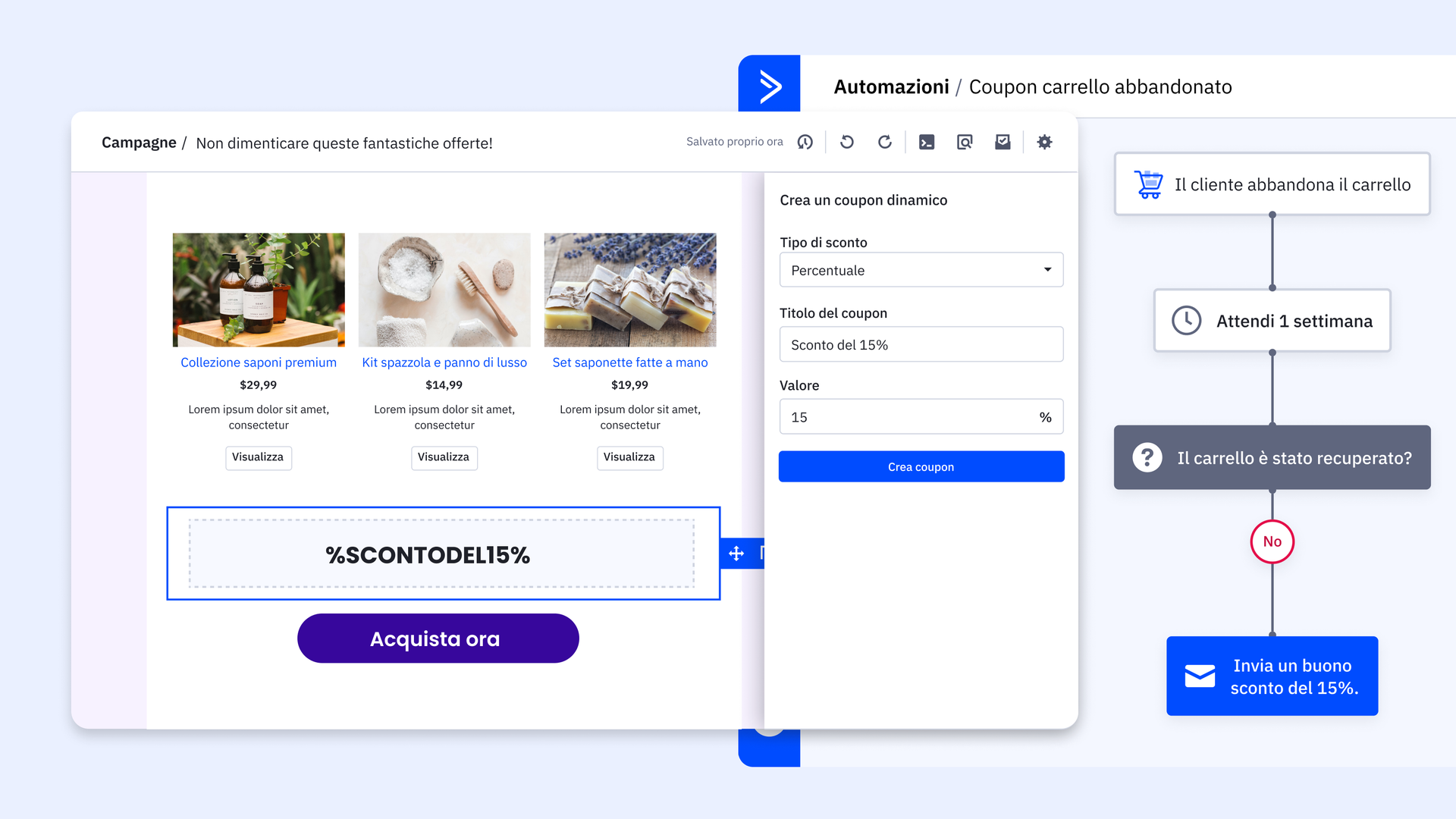 - Recupera carrelli abbandonati: Invia email automatiche con un codice coupon agli acquirenti che hanno lasciato articoli nel carrello. Questo li incoraggia a tornare e completare l'acquisto, riducendo i tassi di abbandono del carrello.