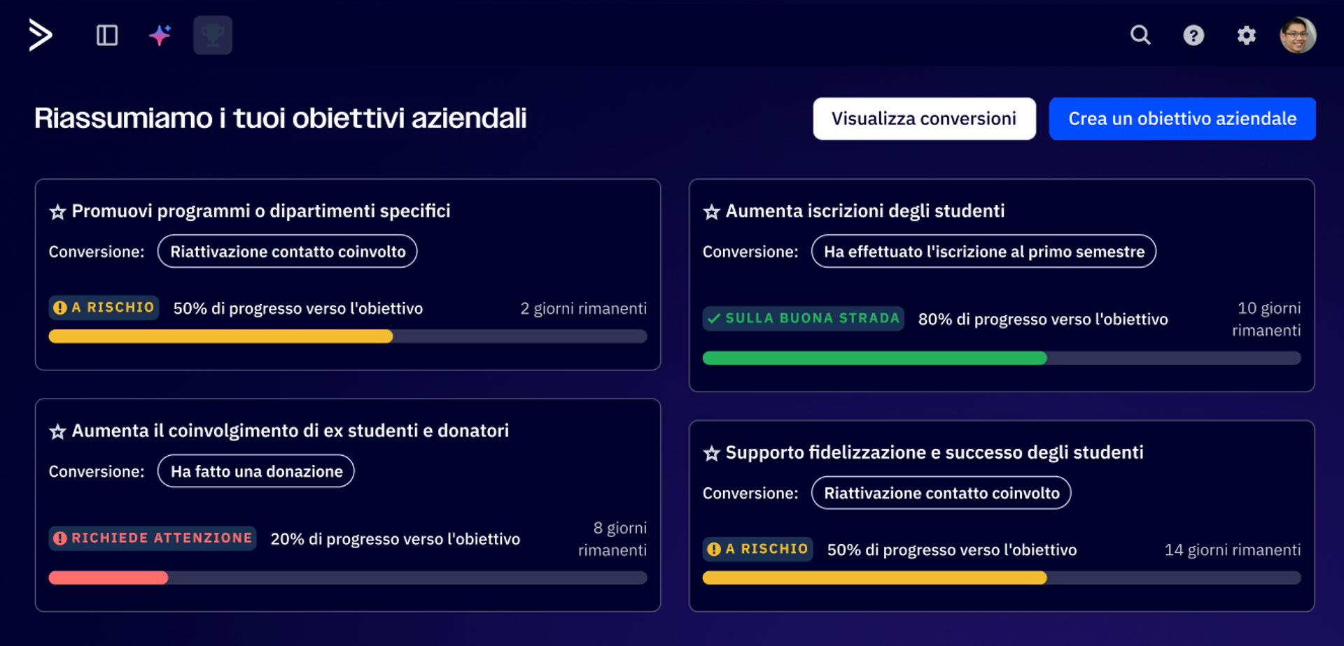 La dashboard di Business Goals di ActiveCampaign monitora i professi su quattro obiettivi chiave istituzionali con indicatori dello stato in tempo reale e conti alla rovescia per le scadenze.