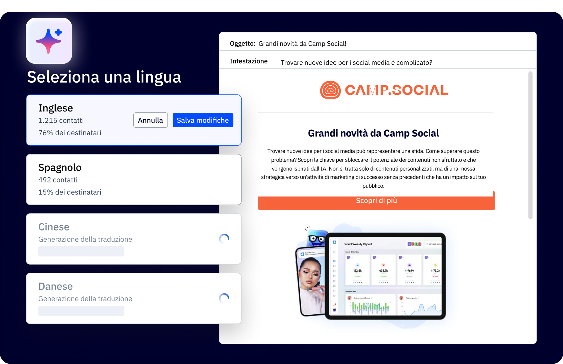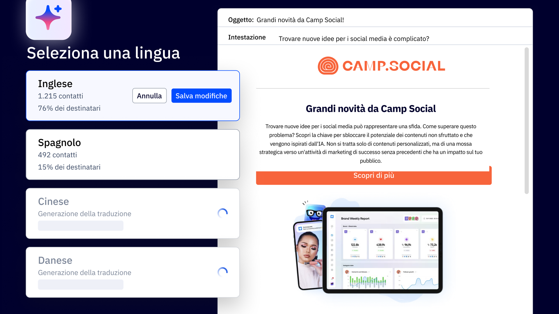 - Lancia email multilingue in meno tempo senza dover ricostruire le campagne per ogni lingua.
