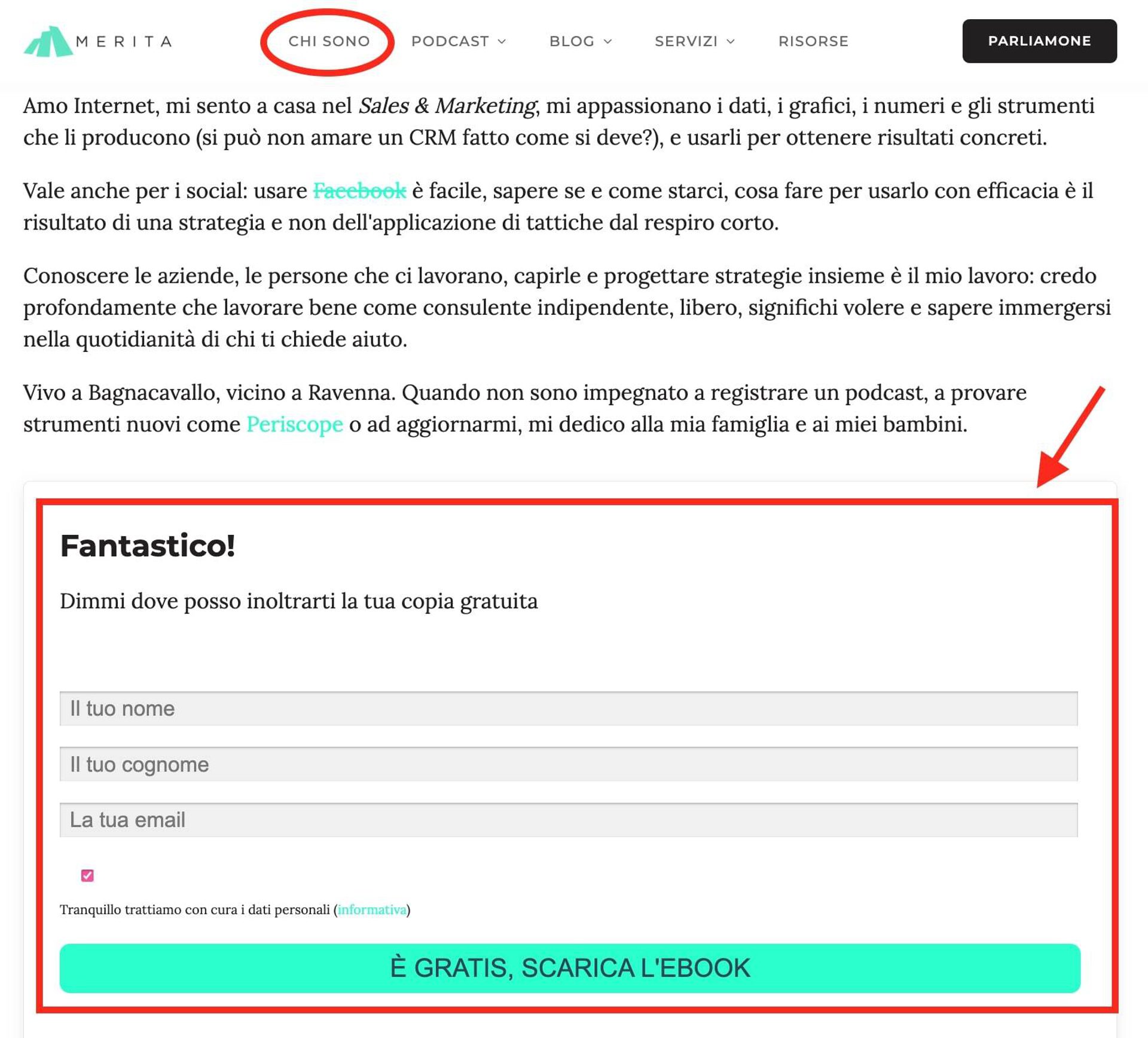 Inoltre, dal momento che hanno già avuto occasione di conoscerti, gli iscritti che compilano il modulo di opt-in email da una pagina “Su di noi” – come quelli che decidono di iscriversi e ricevere l’ebook di Giorgio Minguzzi – tendono a interagire di più e a convertirsi più facilmente in clienti.