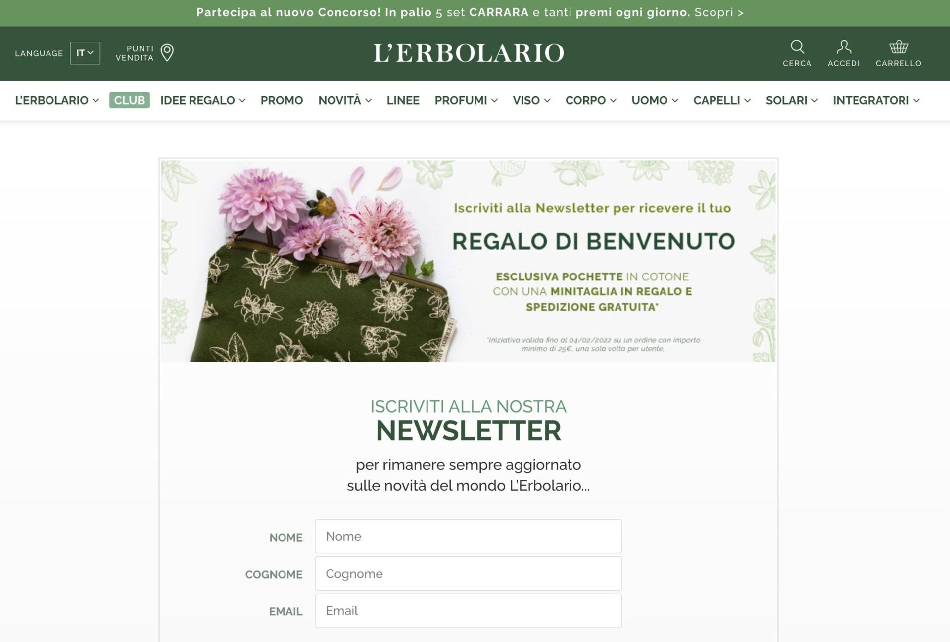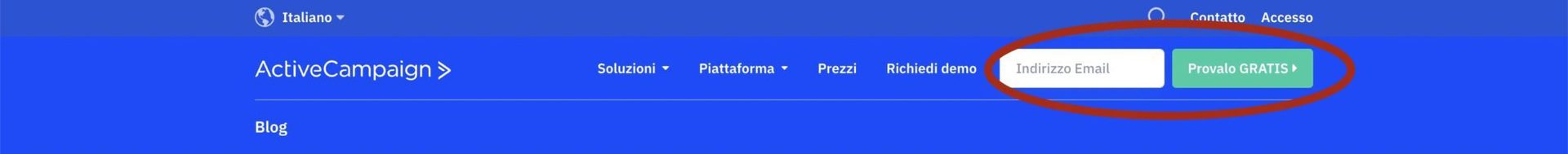 Il modulo di opt-in email nell’intestazione è estremamente visibile.