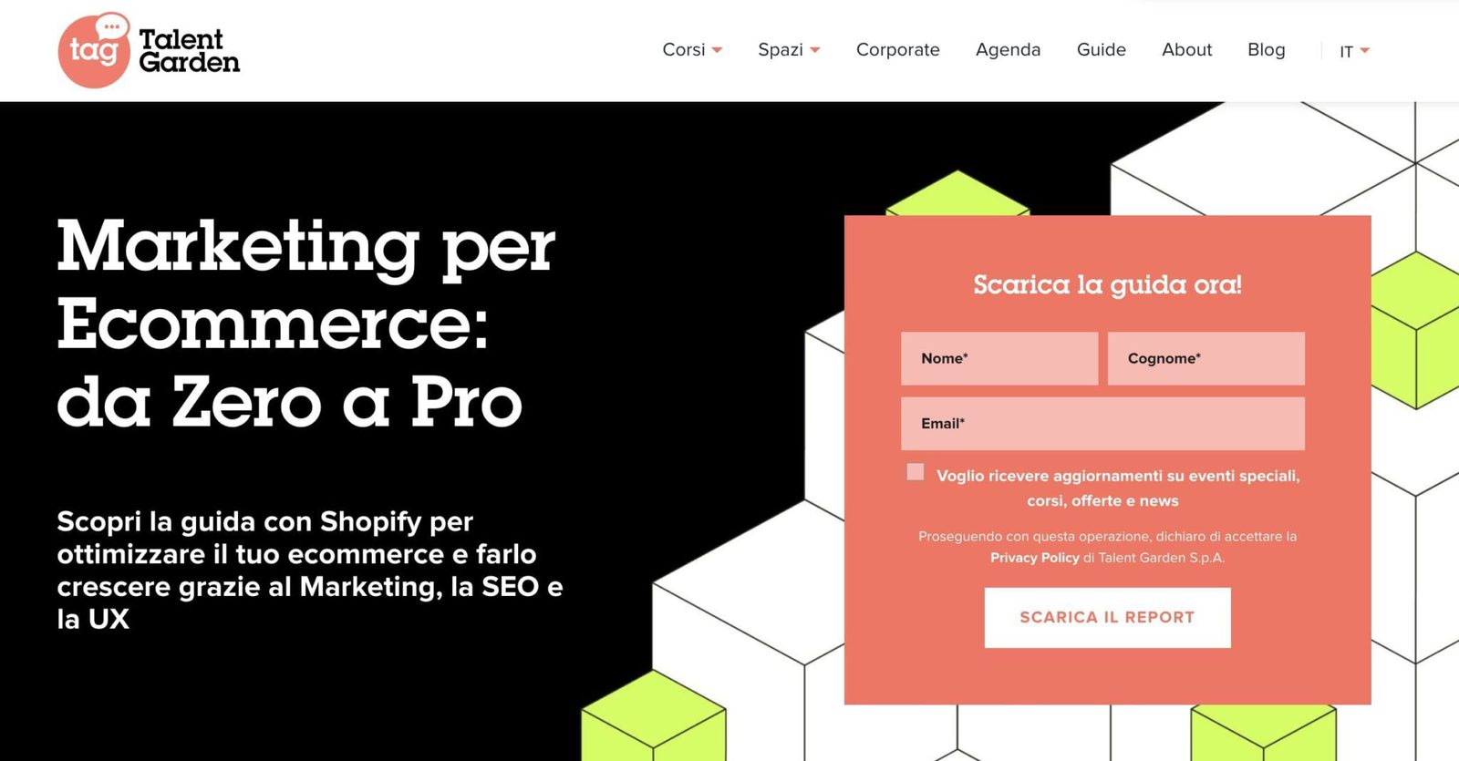 Talent Garden offre una guida, “Marketing per Ecommerce”, grazie alla quale gli utenti possono imparare come ottimizzare e far crescere il loro ecommerce.