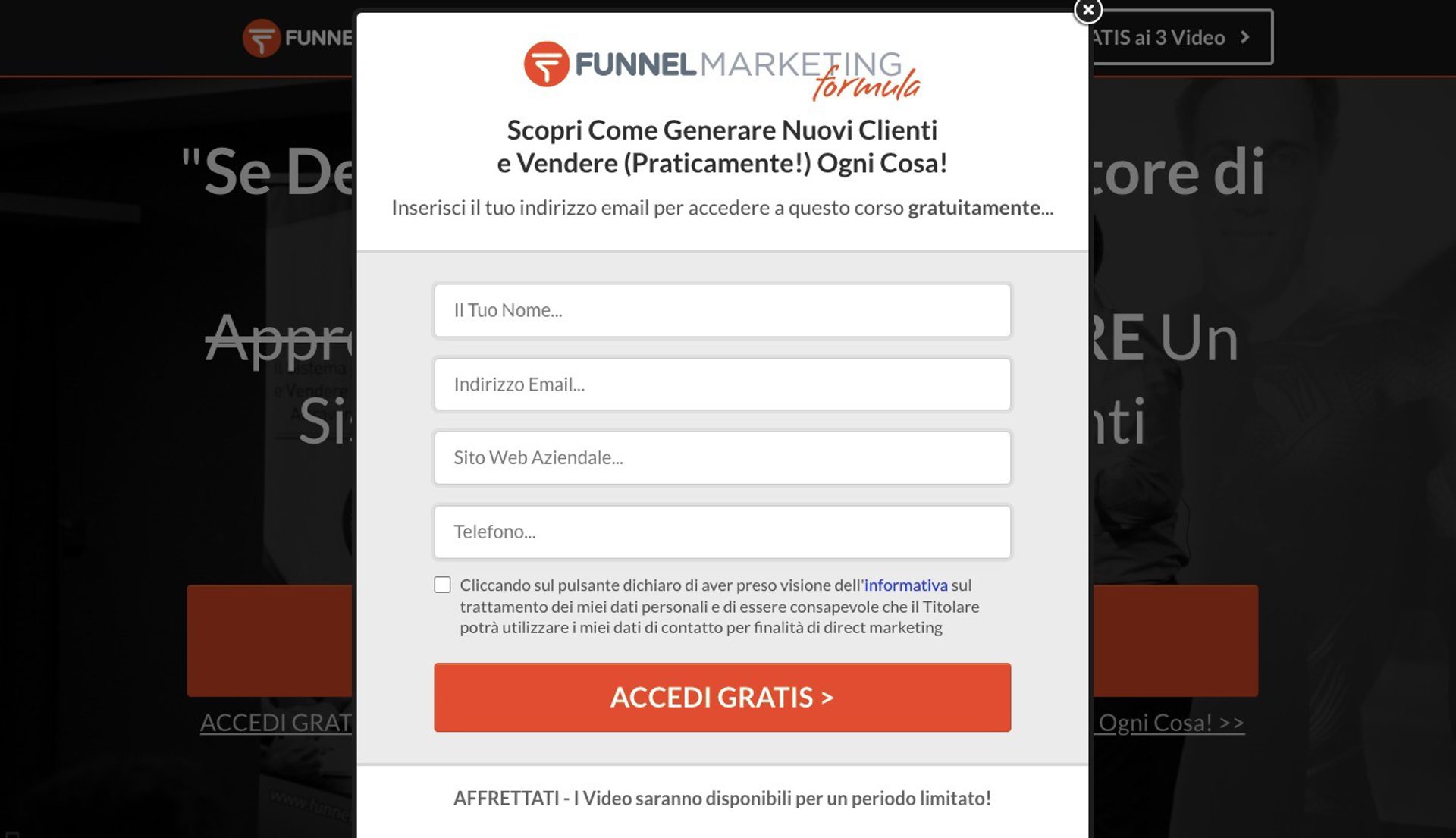 Funnel Marketing Formula usa un’intestazione chiara e provocatoria (“vendere praticamente ogni cosa”) per convincere gli aspiranti imprenditori ad iscriversi al suo corso.