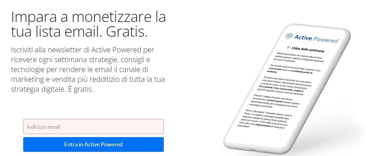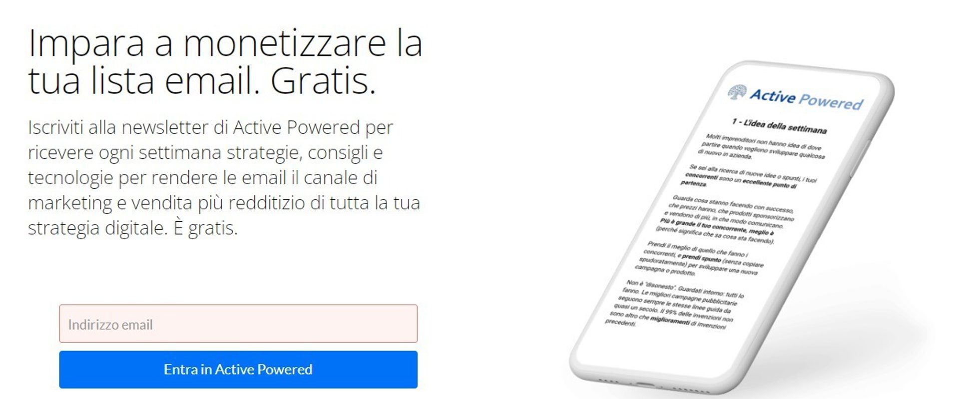 Un breve ma potente testo per convincere l’utente a iscriversi (gratuitamente) alla newsletter che gli permetterà di monetizzare la propria lista email.