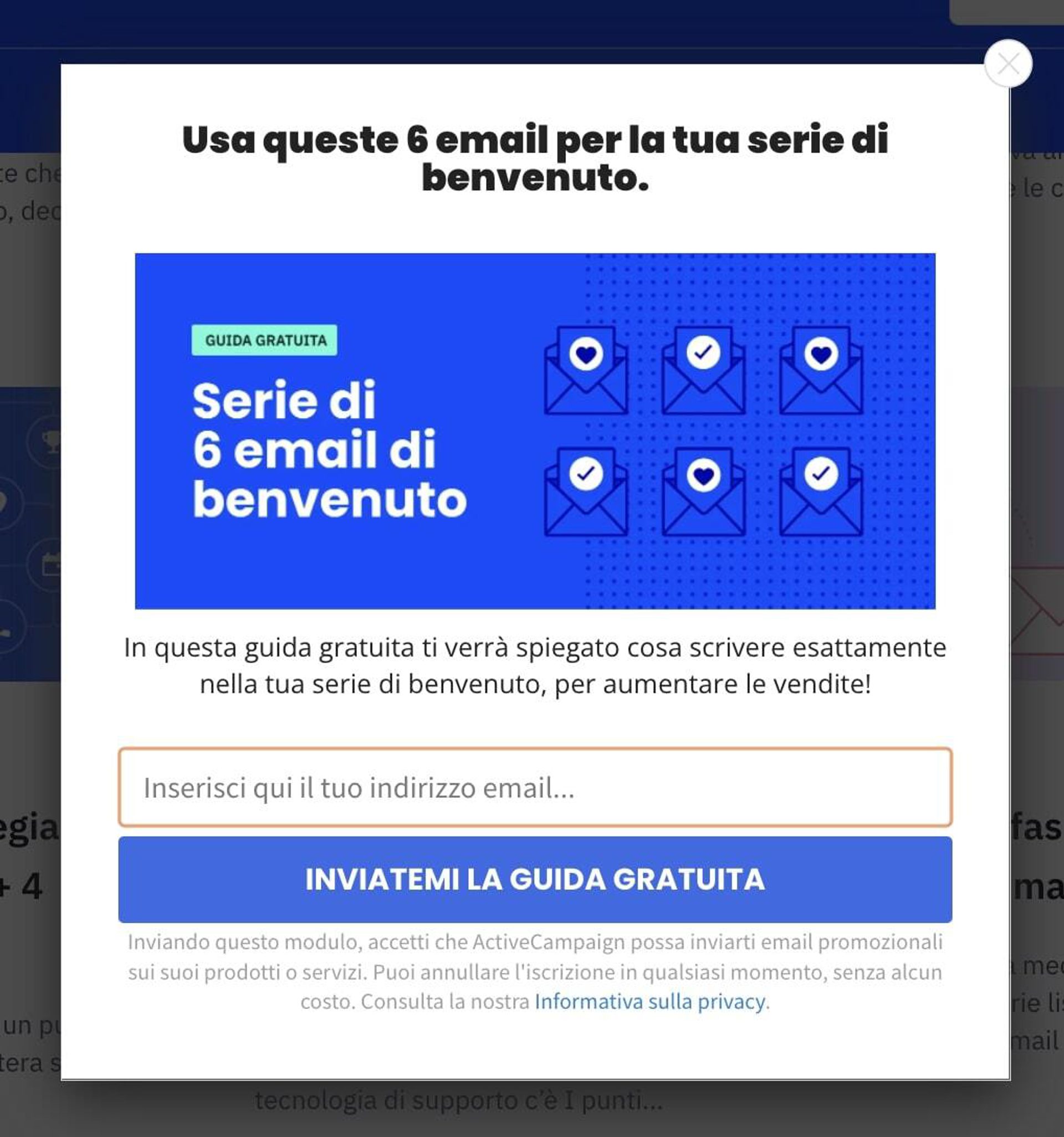 ActiveCampaign offre una guida gratuita per creare 6 email di benvenuto con il preciso obiettivo di aumentare le vendite: il tutto semplicemente compilando il modulo di opt-in per iscriversi alla newsletter.