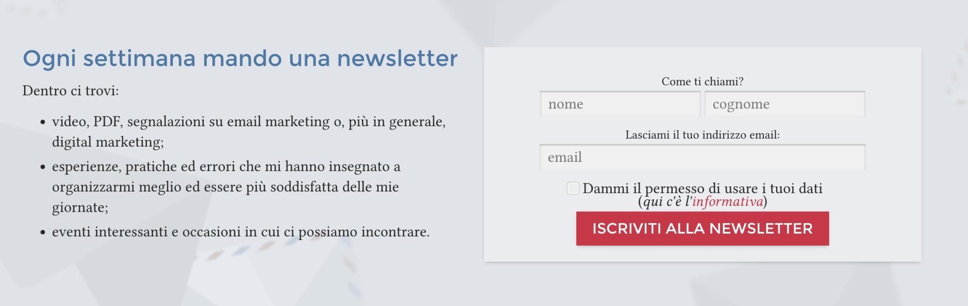 - Il copy è semplice e diretto, e spiega in poche parole come l’iscrizione alla newsletter potrà risolvere il problema del lettore;
