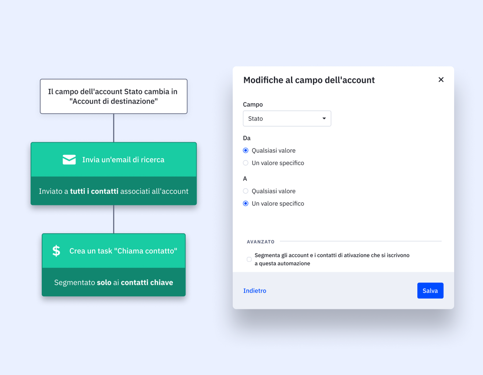 - Trigger di modifica del campo dell'account: Questo trigger B2B basato sull'account, primo nel suo genere, consente alle aziende di avviare automazioni basate sulle modifiche a qualsiasi campo dell'account, con conseguente miglioramento dei processi, una raggio d'azione più efficiente, un maggiore coinvolgimento, connessioni più forti e, in definitiva, relazioni più redditizie.
