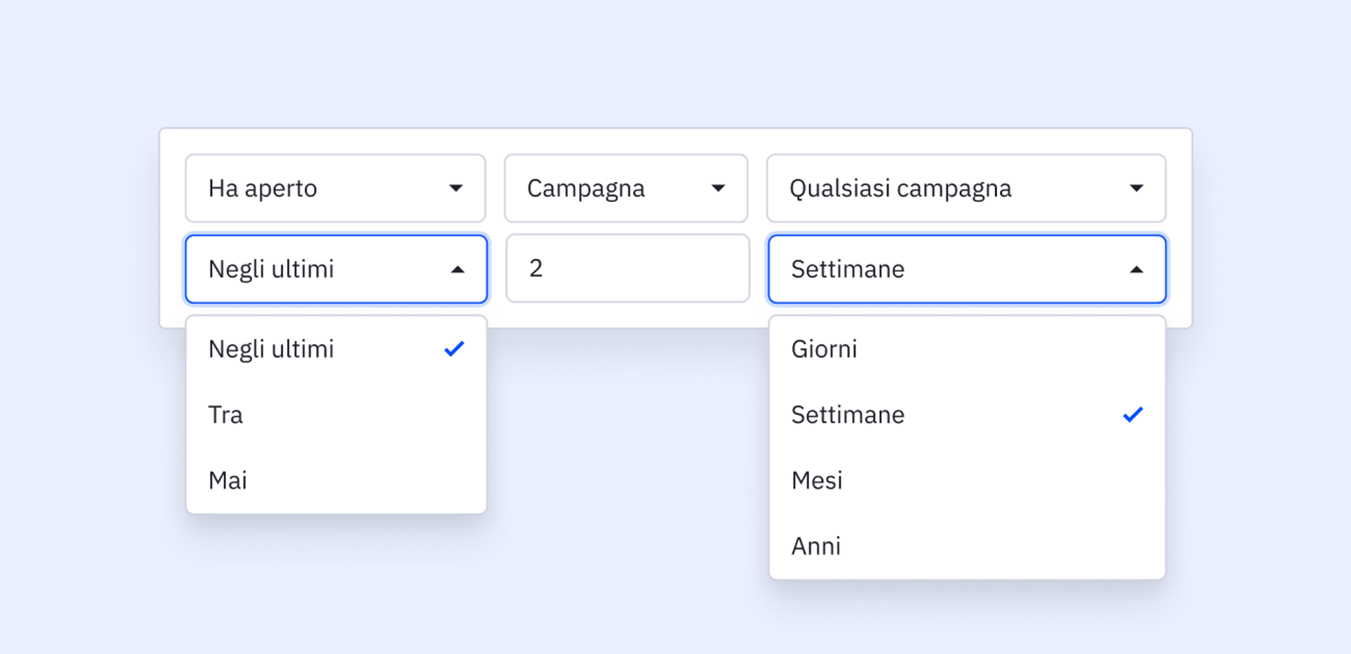 - Finestre attività di email: Promuovi il coinvolgimento sfruttando le finestre attività sulle varie condizioni delle email. Niente più congetture o affidamento ai tag per una maggiore pertinenza del messaggio. Scopri di più su come creare segmenti utilizzando questa funzione.
