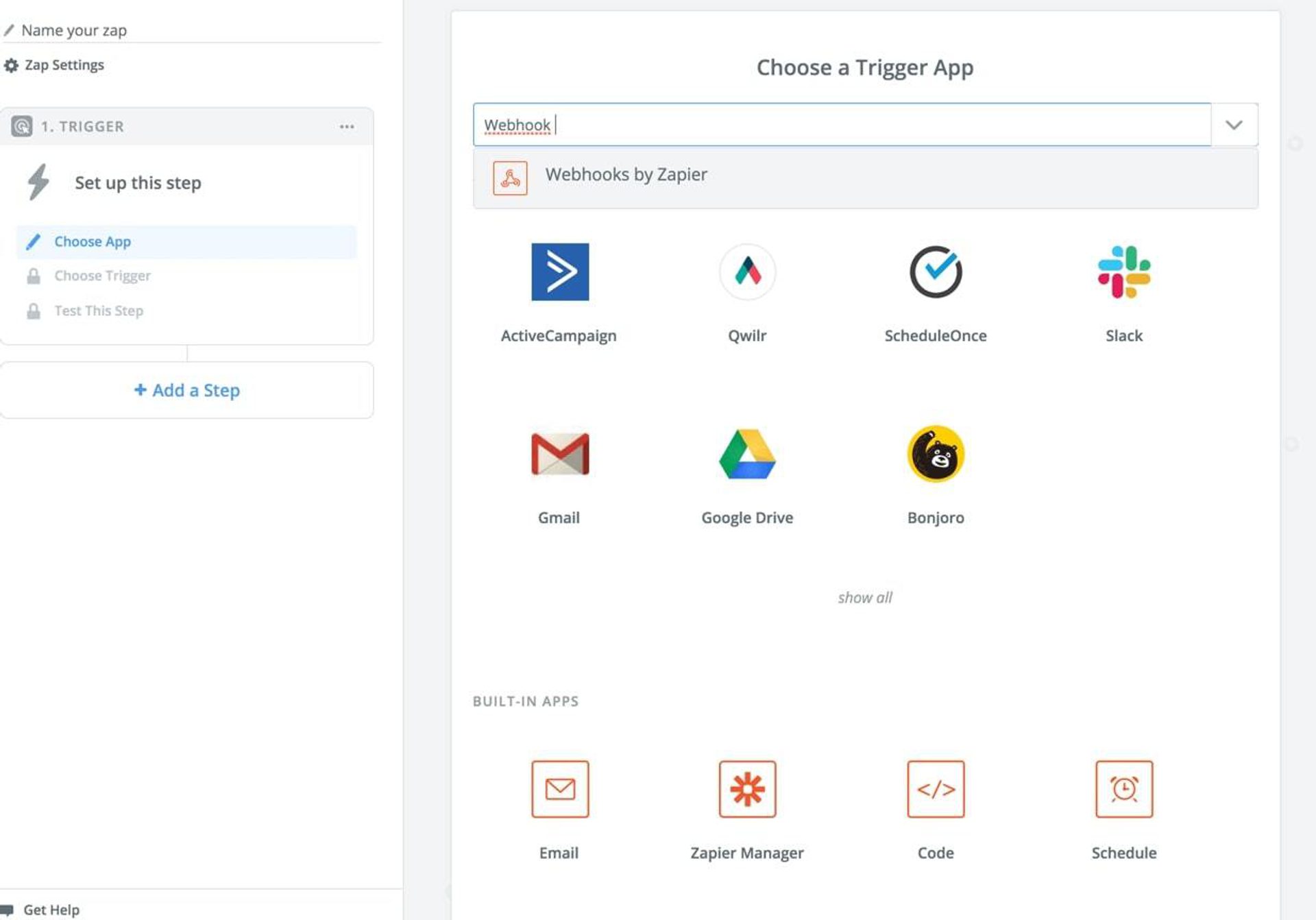 Nell’account Zapier, bisogna andare su “Crea un nuovo Zap”: cerca Webhook e ti apparirà direttamente l’app.