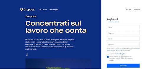 In questo caso Dropbox invita gli utenti a compilare il form per la registrazione. La CTA si limita a un semplice “Registrati” al termine del form, mentre “Concentrati sul lavoro che conta” è l’elemento che mostra il valore del prodotto.