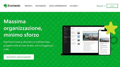 A seguire troviamo Evernote. Il testo colpisce per la sua chiarezza: “Massima organizzazione, minimo sforzo”, seguito da alcune righe che chiariscono ulteriormente quello che il prodotto può fare per l’utente. La CTA, invece, aggiunge un elemento fondamentale rispetto a quanto abbiamo visto con Dropbox: la possibilità per l’utente di registrarsi senza mettere mano al portafoglio.