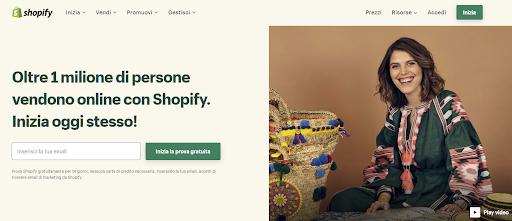 Chiudiamo con Shopify: il celebre servizio e-commerce invita a iniziare la prova in modo gratuito con un pulsante CTA molto ben delineato, richiedendo di compilare un solo campo (scelta sicuramente perfetta per massimizzare la lead generation). Prima del pulsante troviamo un riferimento al successo globale del brand. In basso, le informazioni aggiuntive sulla promozione.