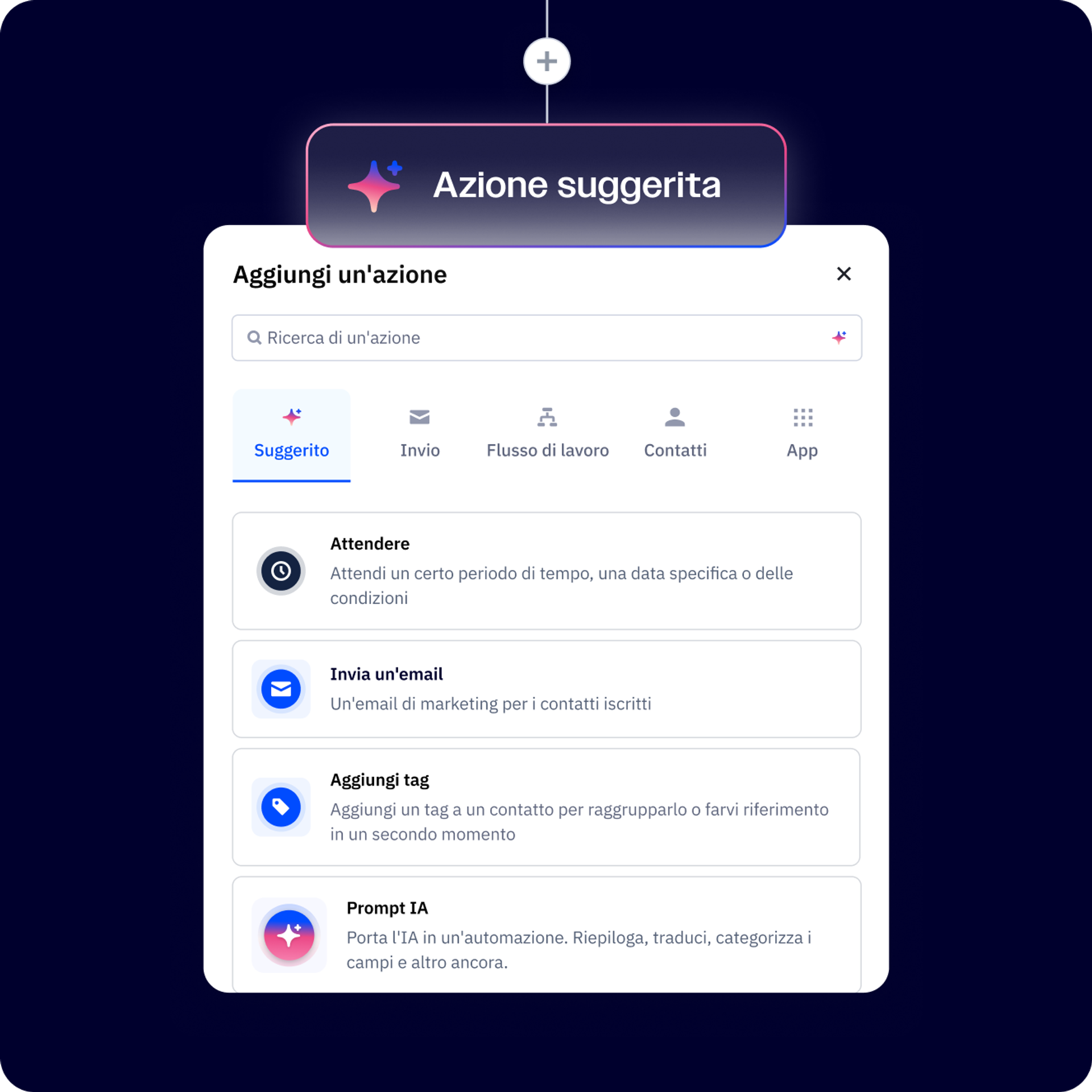 Mentre crei le tue automazioni, le azioni suggerite dall'IA di ActiveCampaign forniscono consigli basati sul comportamento dei contatti, sulla cronologia di coinvolgimento e sulle best practice del settore per suggerire le azioni con il maggiore impatto, in modo da semplificare la creazione delle automazioni.