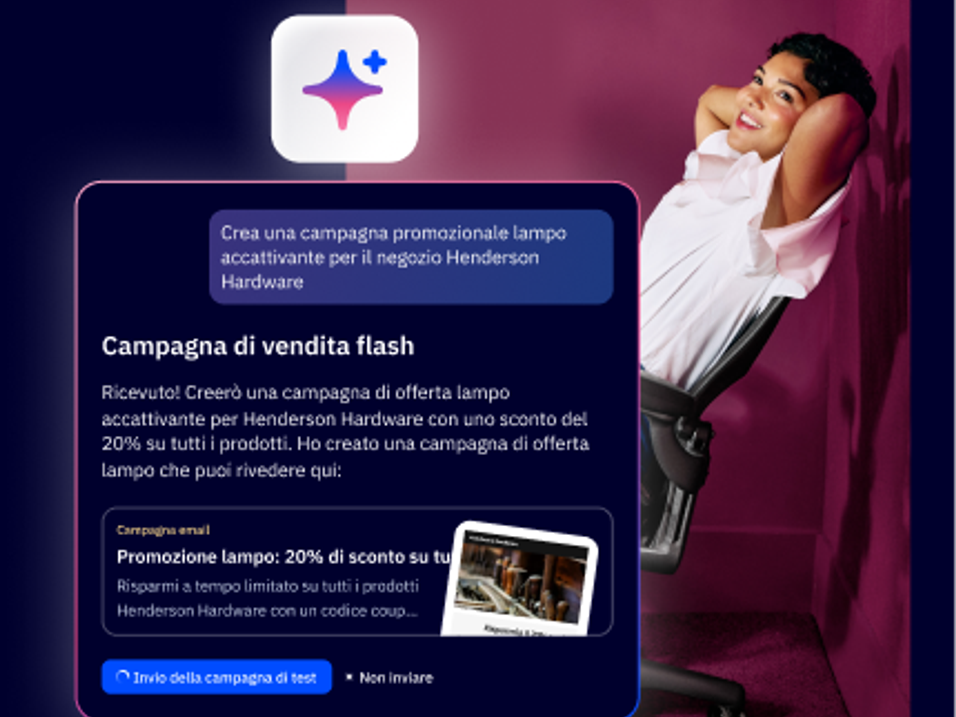 Utilizza la Libreria azioni AI (in inglese) per inserire un prompt conversazionale, e l'IA tradurrà immediatamente i tuoi obiettivi in strategie efficaci e orientate alla conversione, da oggetti delle email persuasivi alla scelta dei canali ideali.