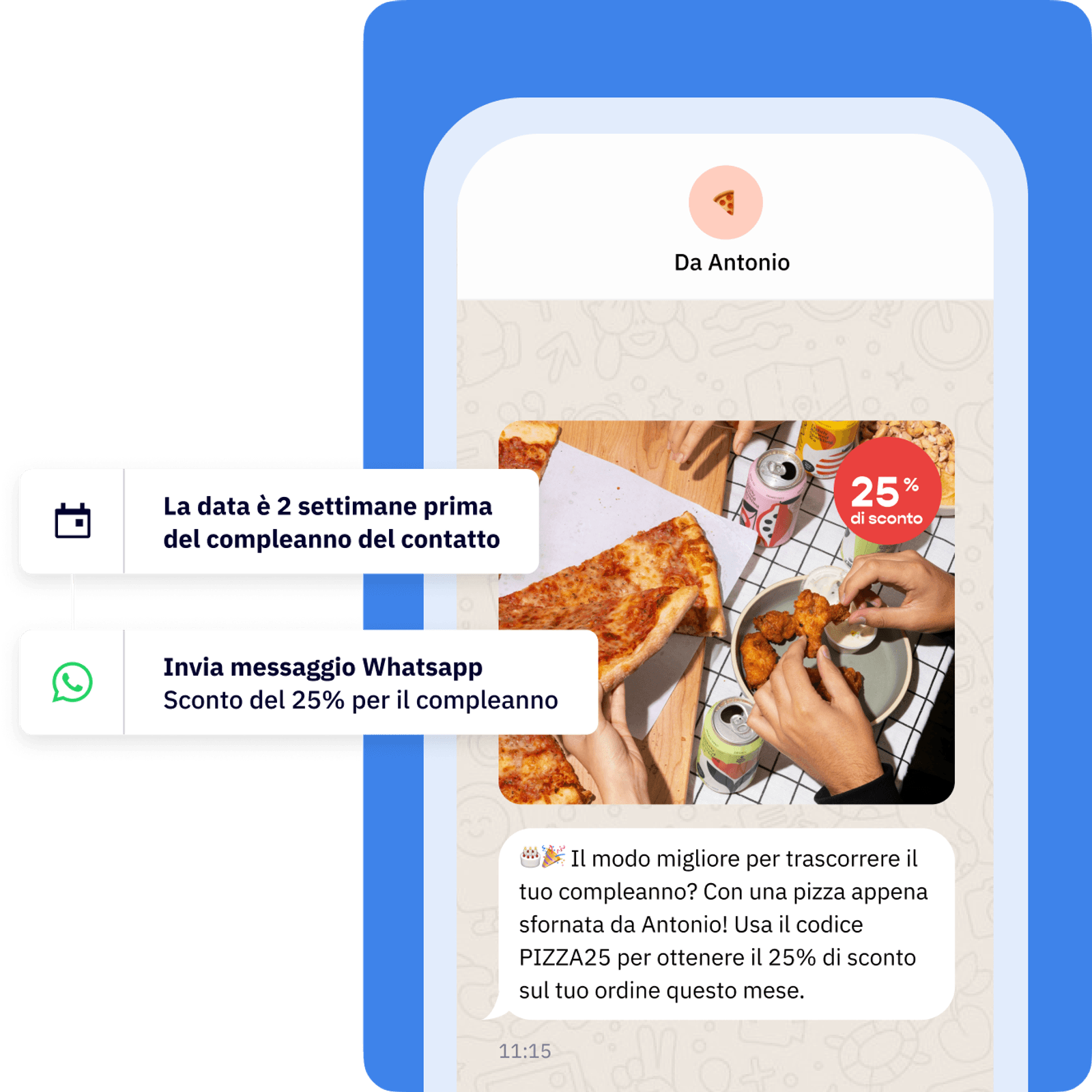 Crea conversazioni 1:1 personalizzate con l'automazione intelligente. La messaggistica di WhatsApp consente di chattare sempre con i tuoi clienti, che si tratti del tuo canale principale o di un'estensione delle tue campagne.
