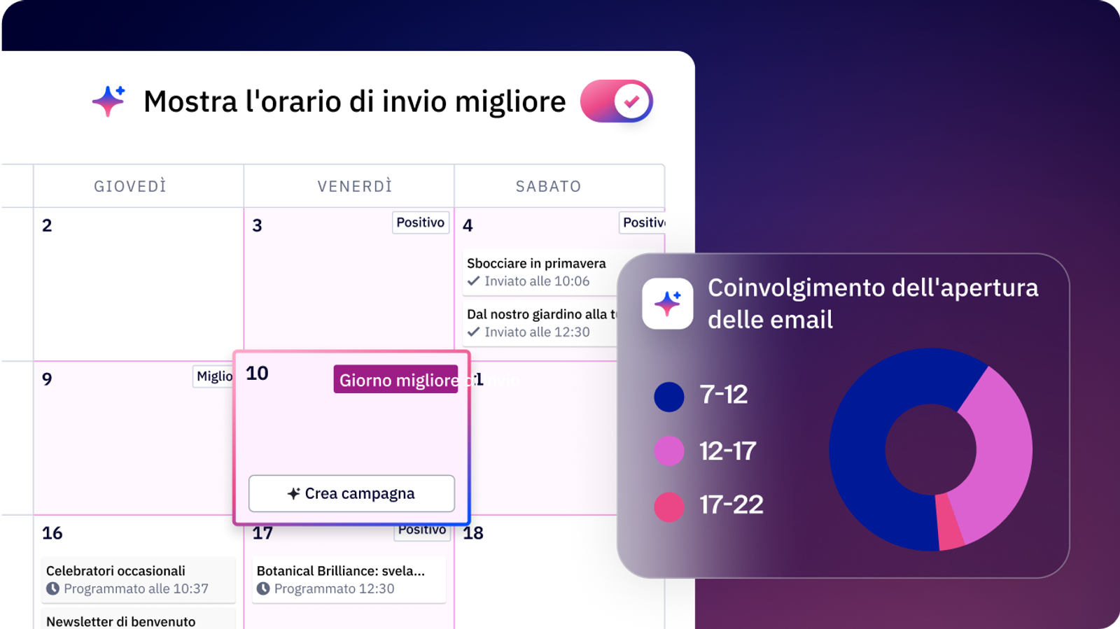 Invia le tue campagne tramite email, SMS, WhatsApp e canali social con tempistiche intelligenti, invio predittivo e segmentazione intelligente gestita per te.