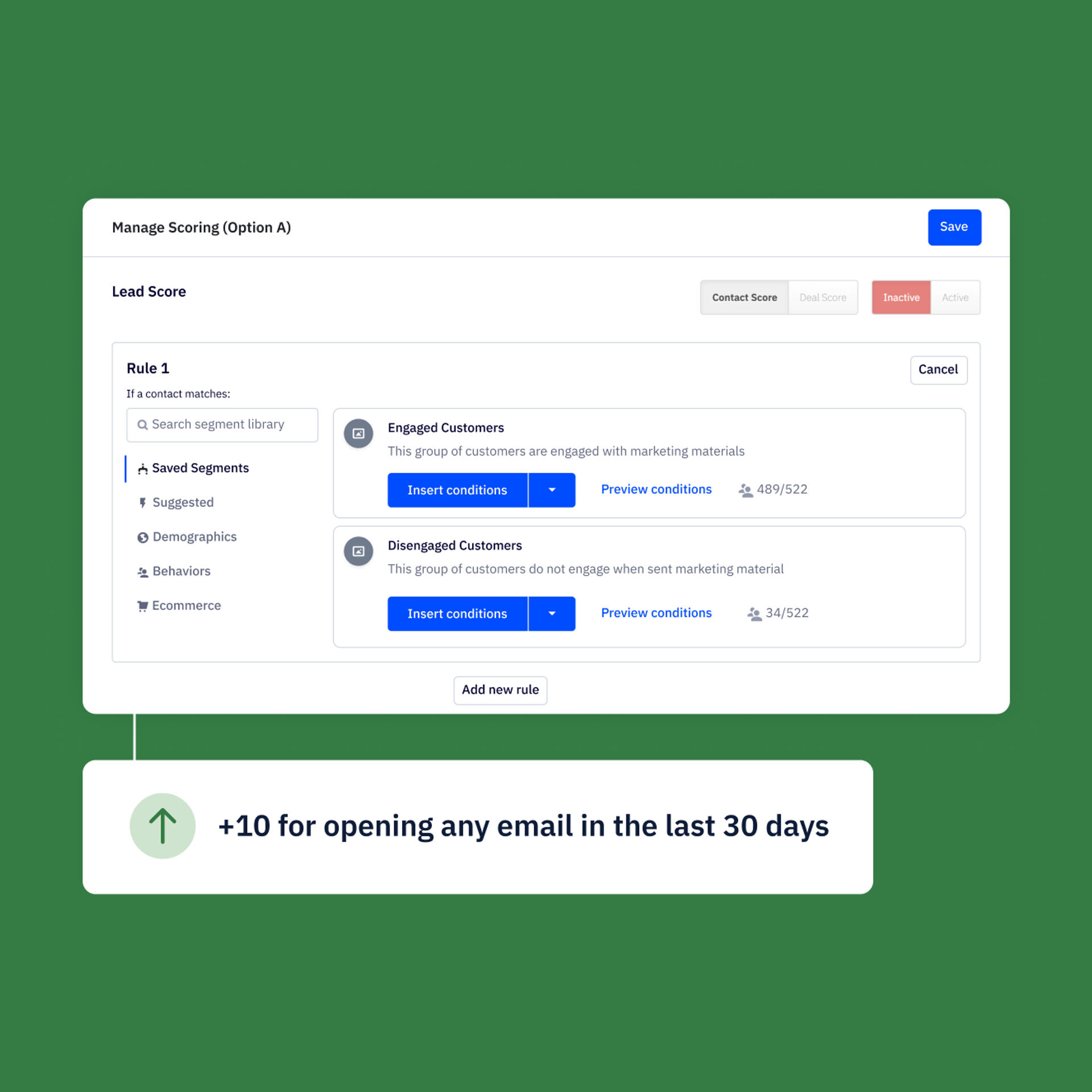 Concentra i tuoi sforzi, dai priorità ai lead principali e genera entrate. I nostri potenti modelli di lead scoring ti aiutano a identificare i contatti e le opportunità di maggior valore.