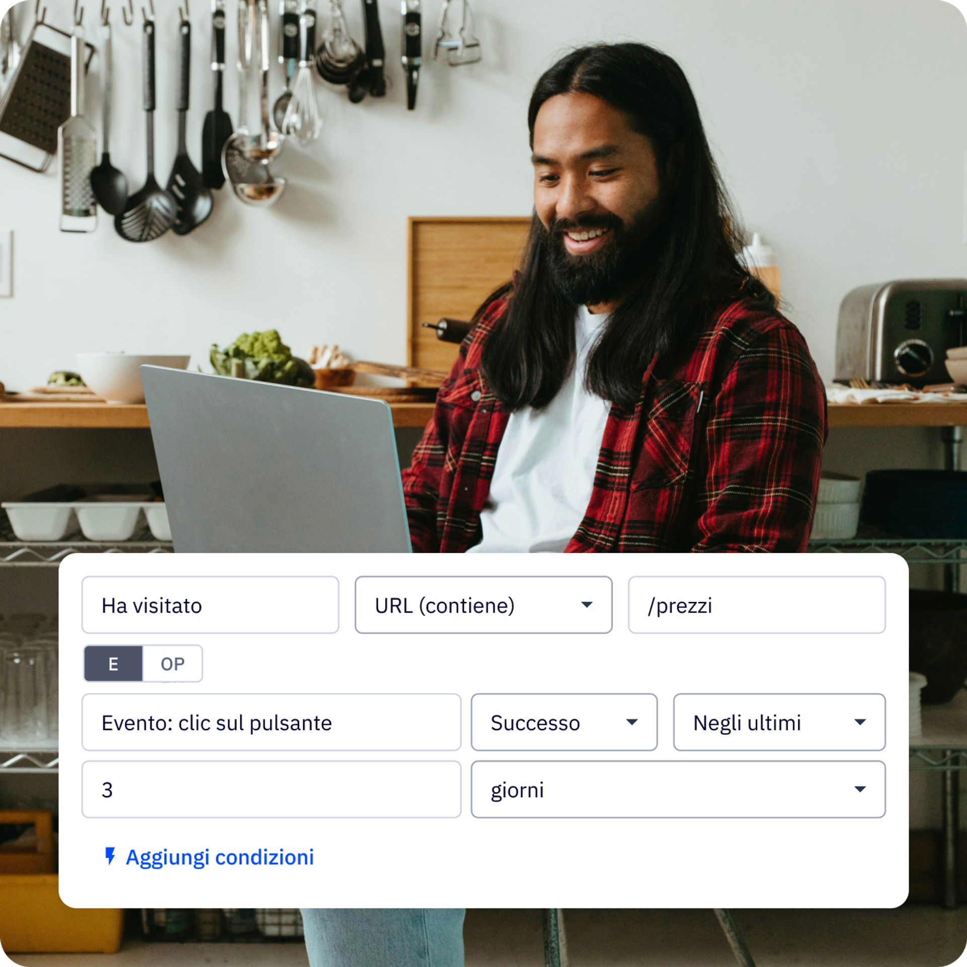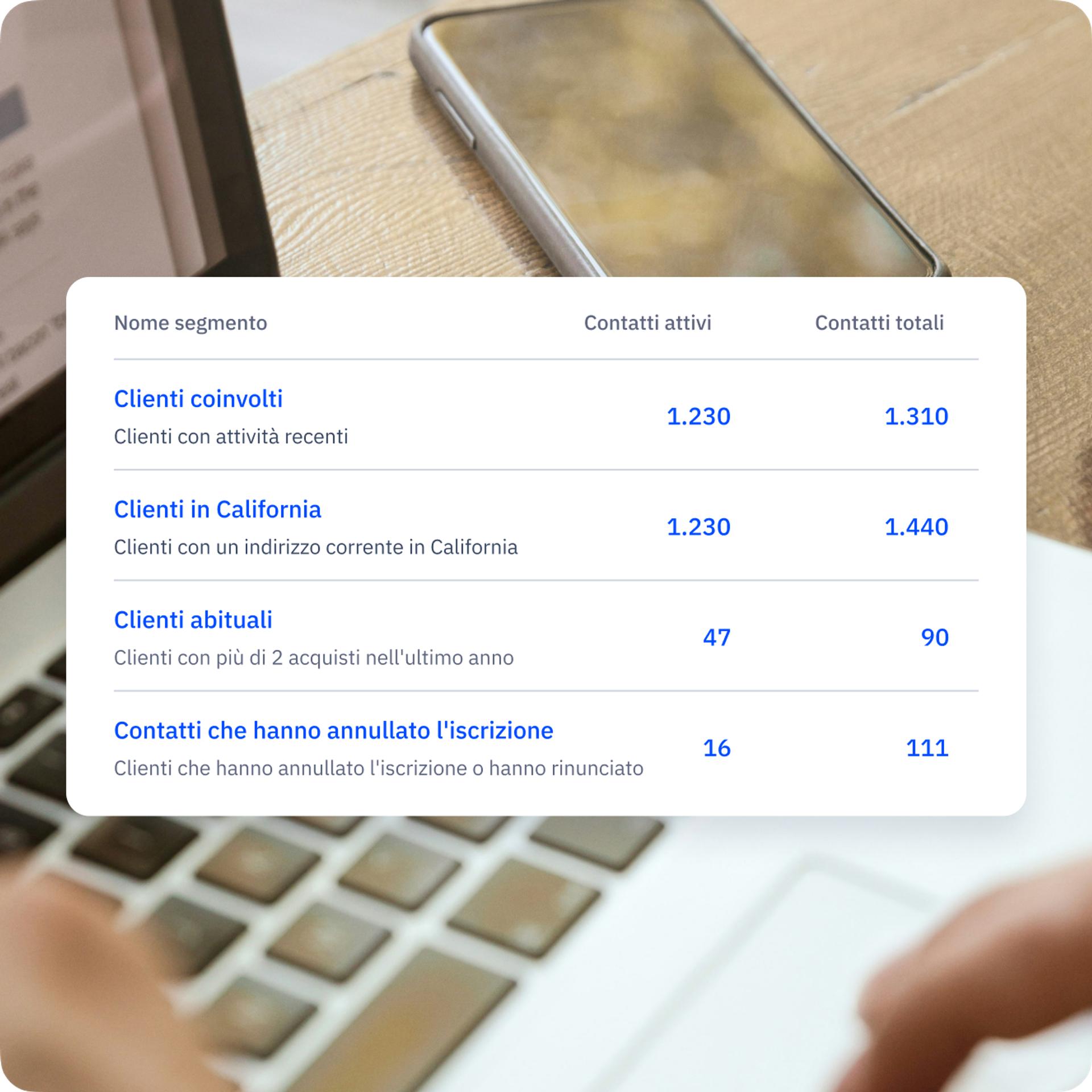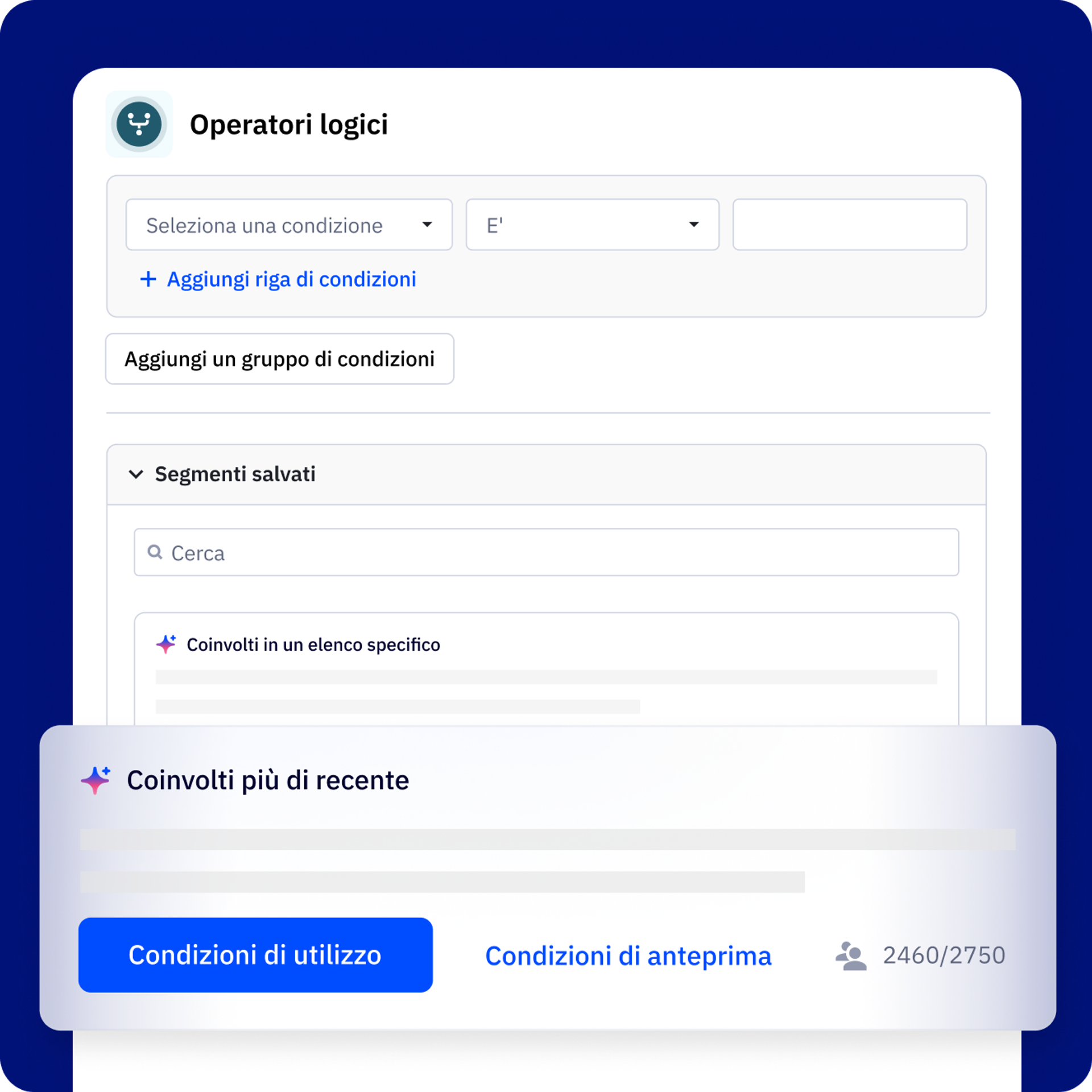 Salta il lavoro di back-end e passa direttamente a ciò che conta: campagne personalizzate che catturano l'attenzione e producono risultati. Individua i contatti pronti all'acquisto e quelli pronti a vivere esperienze più significative.