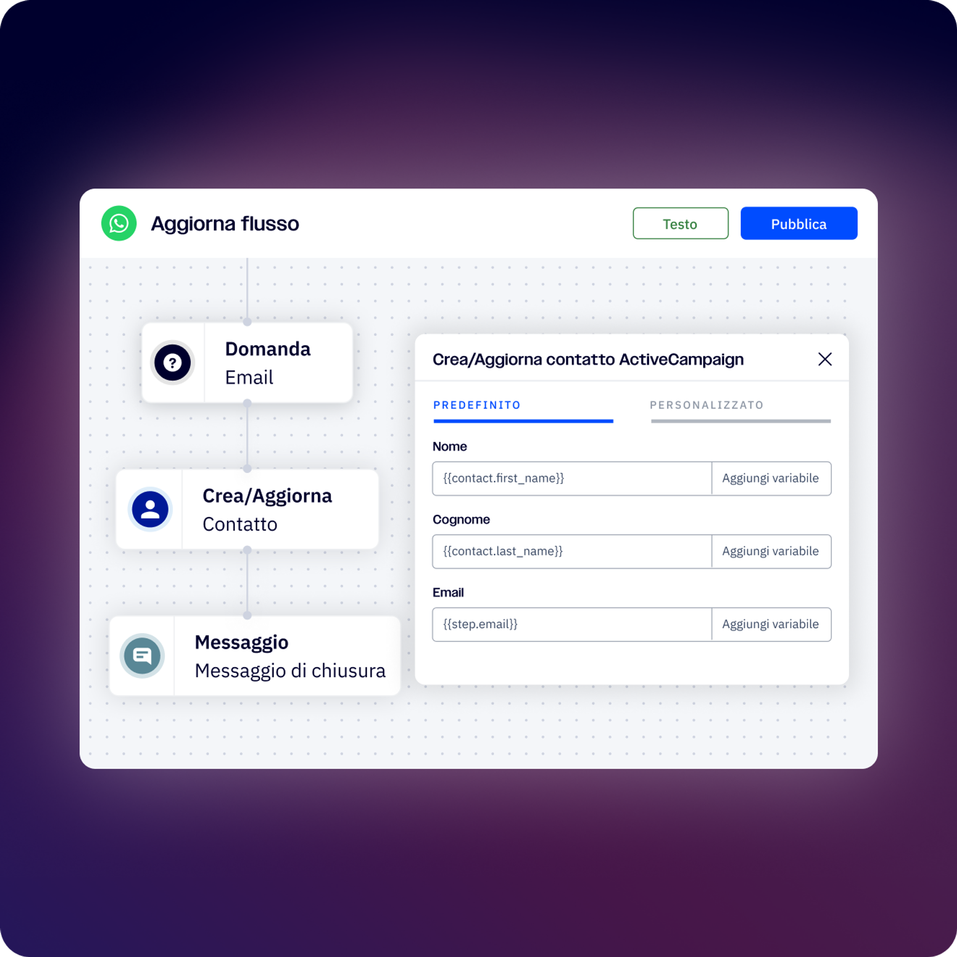 La funzionalità Messaggistica WhatsApp di ActiveCampaign permette di creare flussi di chat automatizzati che possono qualificare i lead, rispondere alle domande frequenti e guidare i clienti lungo il loro percorso, tutto all’interno di WhatsApp. Queste automazioni gestiscono task ripetitivi, raccolgono dati e indirizzano le conversazioni al membro del team giusto quando necessario, permettendo al tuo team di concentrarsi su interazioni ad alto valore. Ogni conversazione viene monitorata e può attivare azioni su tutti i tuoi canali di marketing e vendita, garantendo un’esperienza fluida ed efficiente per il team e i clienti.