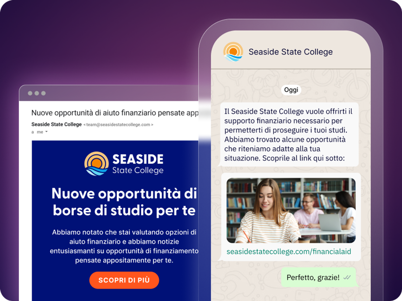 ActiveCampaign semplifica il marketing su WhatsApp (in inglese) permettendo di creare flussi di lavoro automatizzati che inviano messaggi in base al comportamento del cliente, ad esempio abbandono del carrello, traguardi di onboarding o necessità di ri-coinvolgimento. Puoi anche lanciare campagne broadcast con flussi outbound automatici, raggiungendo così i clienti al momento giusto. Poiché WhatsApp funziona insieme a email, SMS e social sulla stessa piattaforma, ogni campagna rimane coordinata, coerente e ottimizzata per ottenere il massimo impatto.
