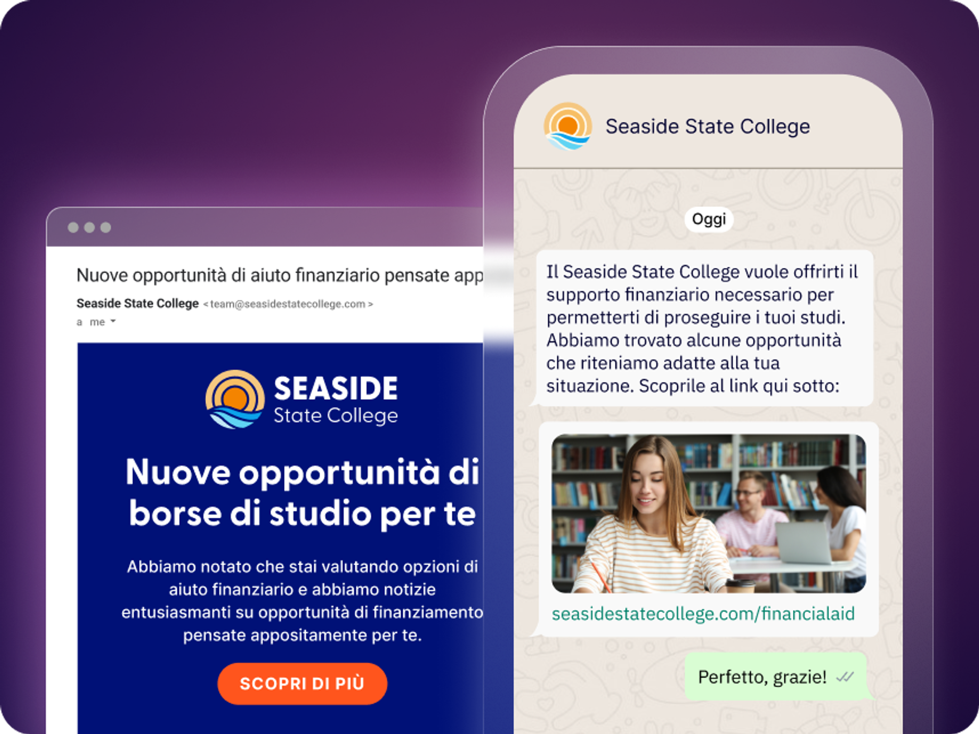 Puoi automatizzare, personalizzare e monitorare le conversazioni su WhatsApp, aggiungendo così un nuovo canale alla tua strategia di marketing, sia come canale indipendente, sia integrato con la stessa piattaforma che usi per le iniziative email, SMS, social media e CRM.