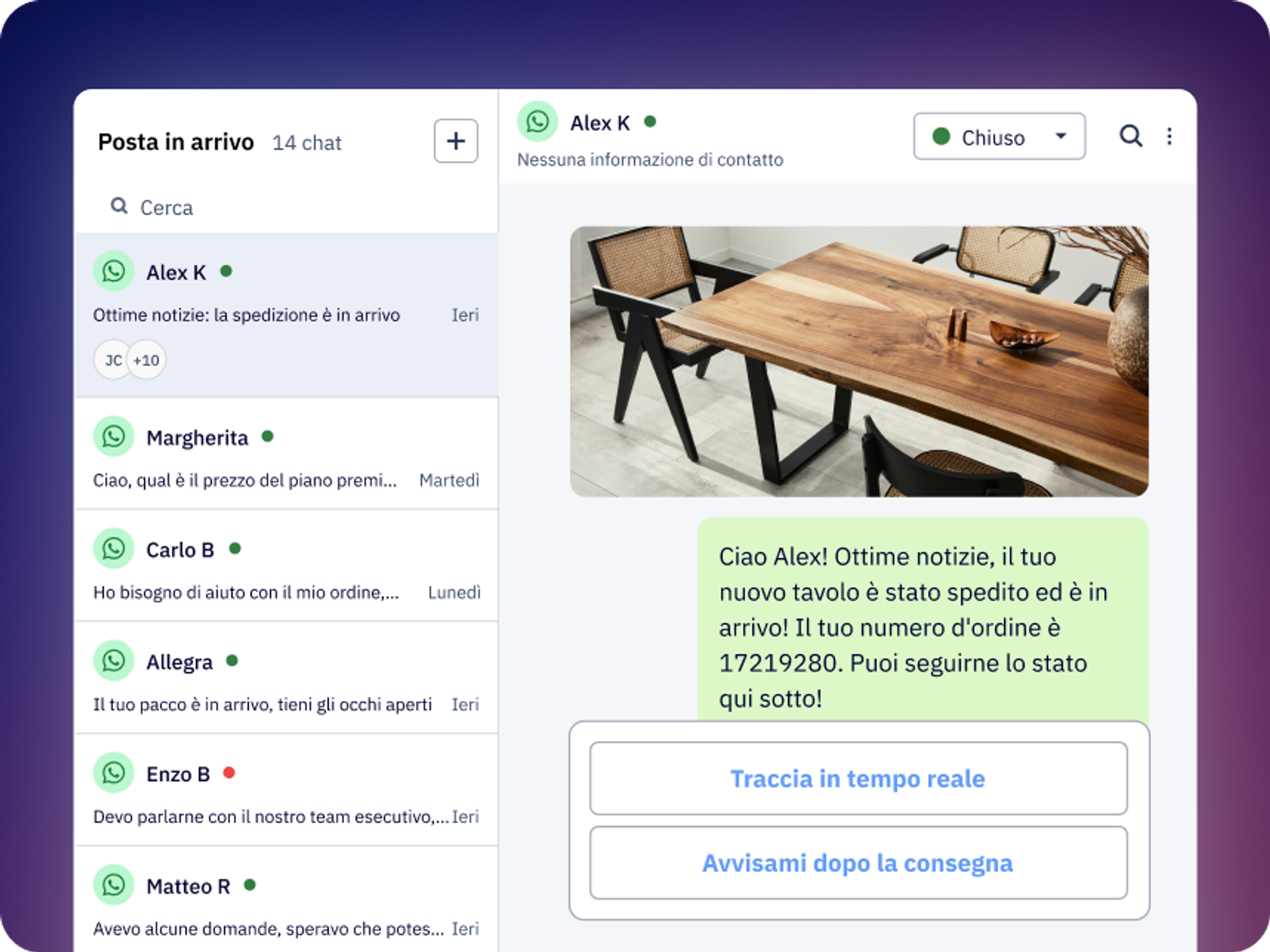 Organizza le conversazioni, assegna etichette e filtra le chat di cui hai bisogno per risparmiare tempo in un'unica posta in arrivo condivisa.