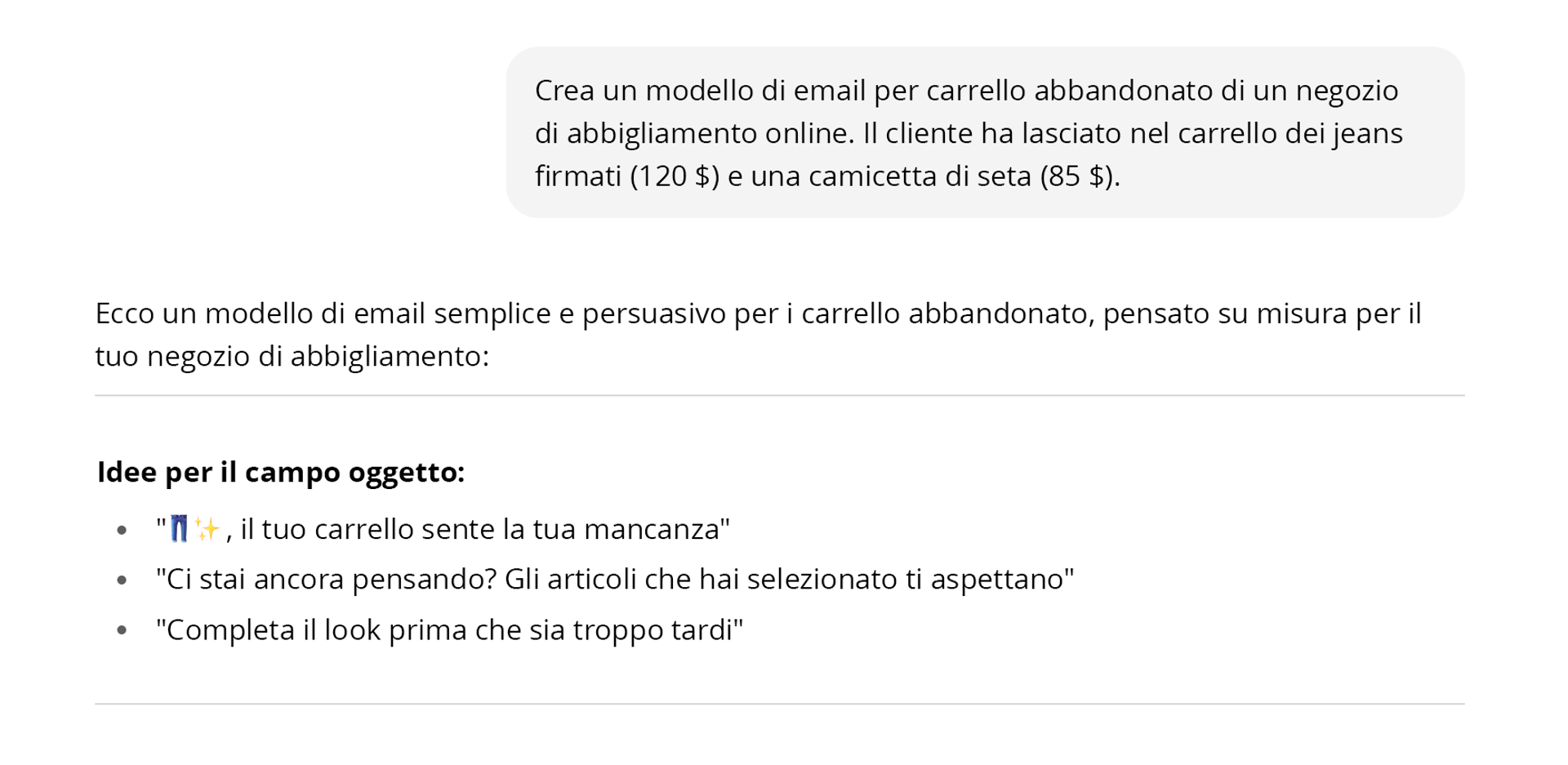 Il segreto dei modelli generati con l'IA sta nel modo in cui formuli la tua richiesta. Al posto di scorrere categorie come "E-commerce > Carrello abbandonato > Stile moderno", descrivi semplicemente la tua situazione in linguaggio naturale.