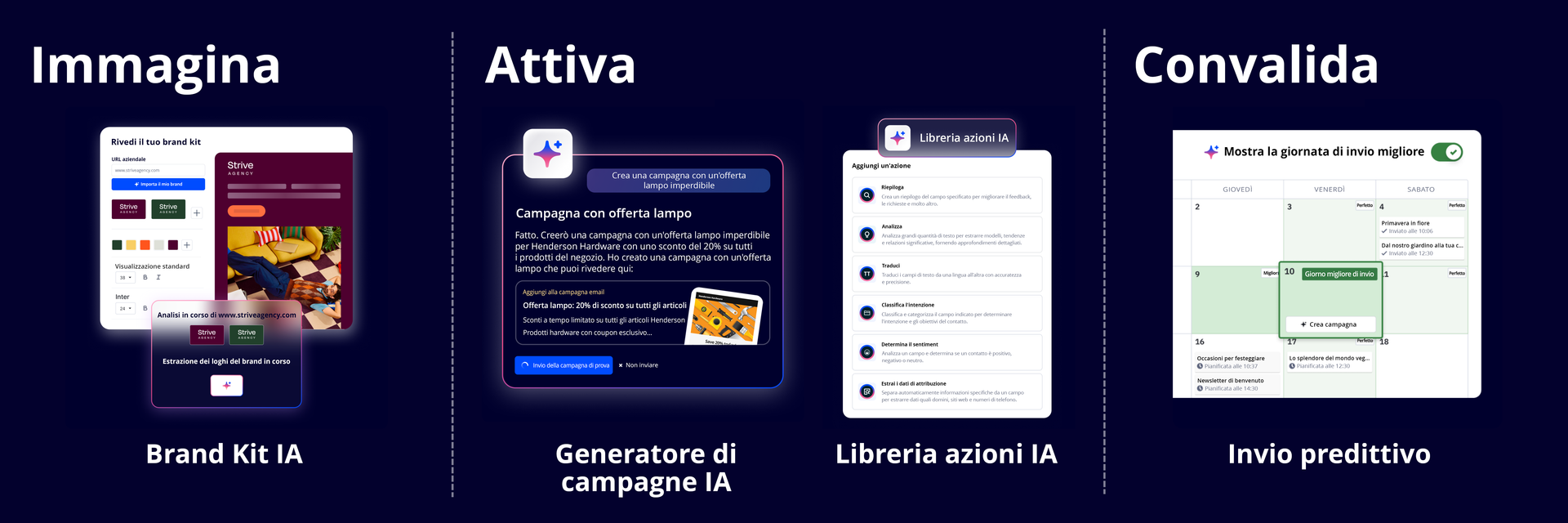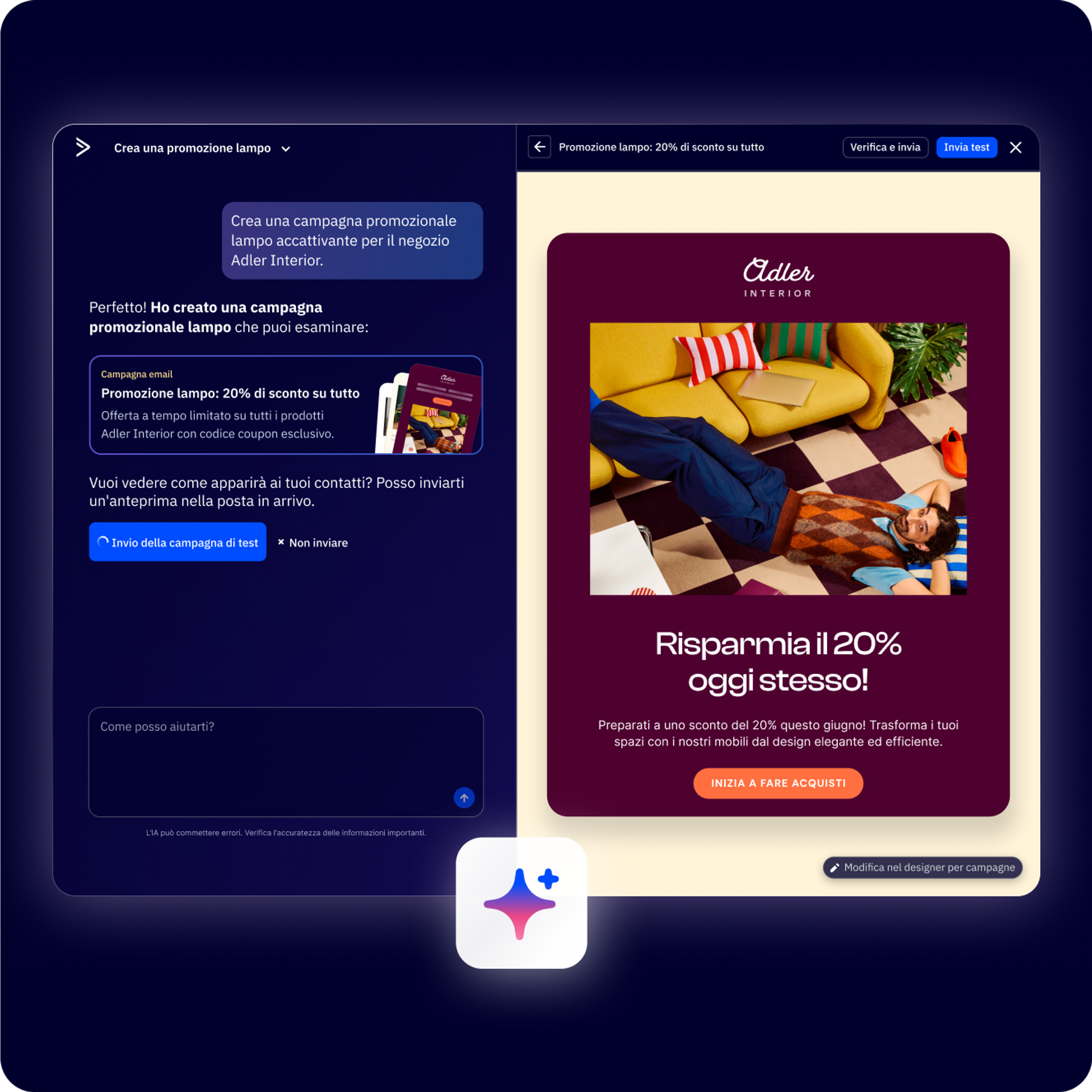 Ora, invece, ti basta dire: "Crea una serie di benvenuto per i nuovi clienti interessati alla sostenibilità". L'IA genera quindi modelli coerenti con il brand, con messaggi pertinenti, in cui i contenuti si adattano automaticamente in base alle azioni degli iscritti, gli orari di invio vengono ottimizzati per ogni contatto e i dati sulle performance alimentano i modelli futuri, migliorandoli continuamente.
