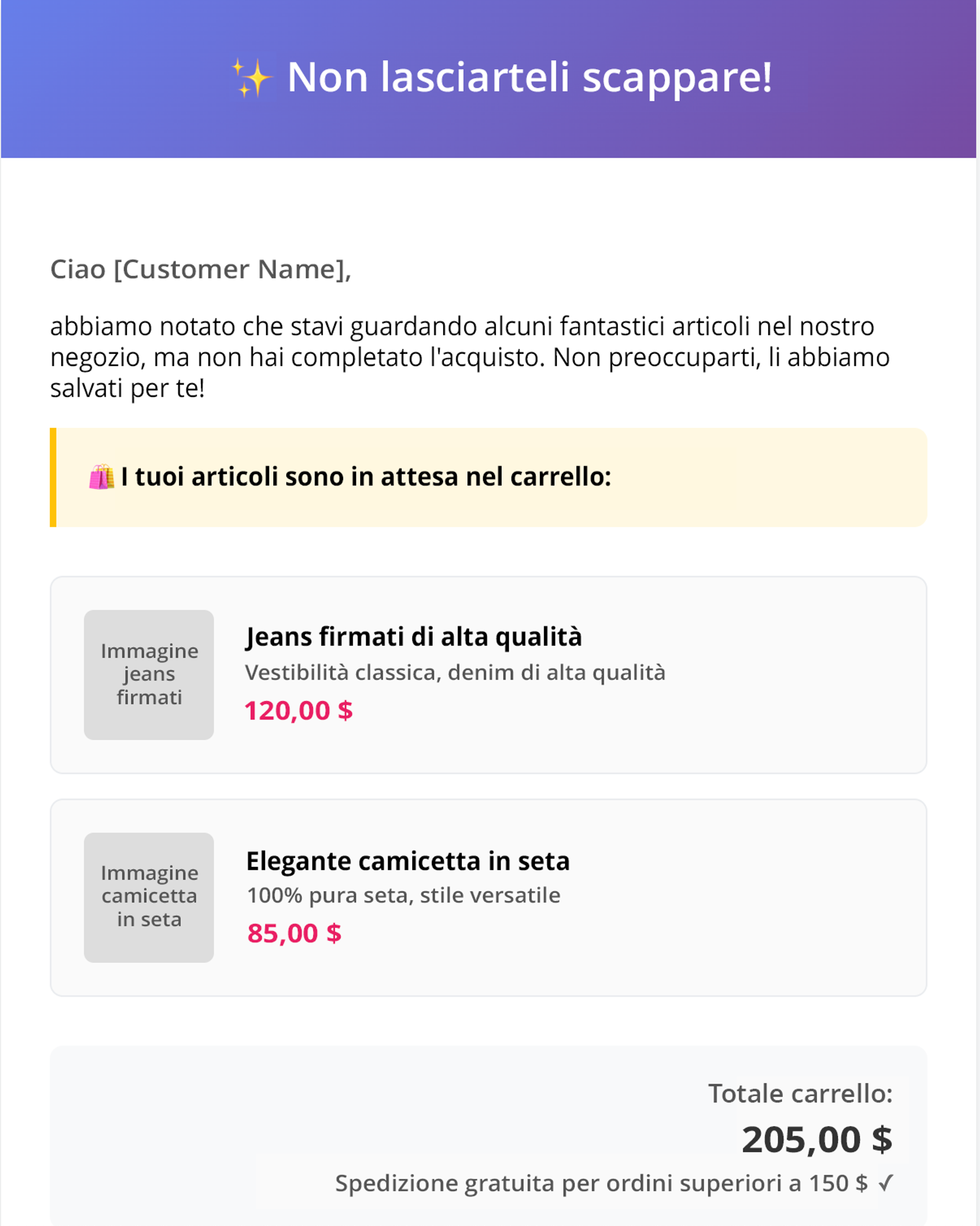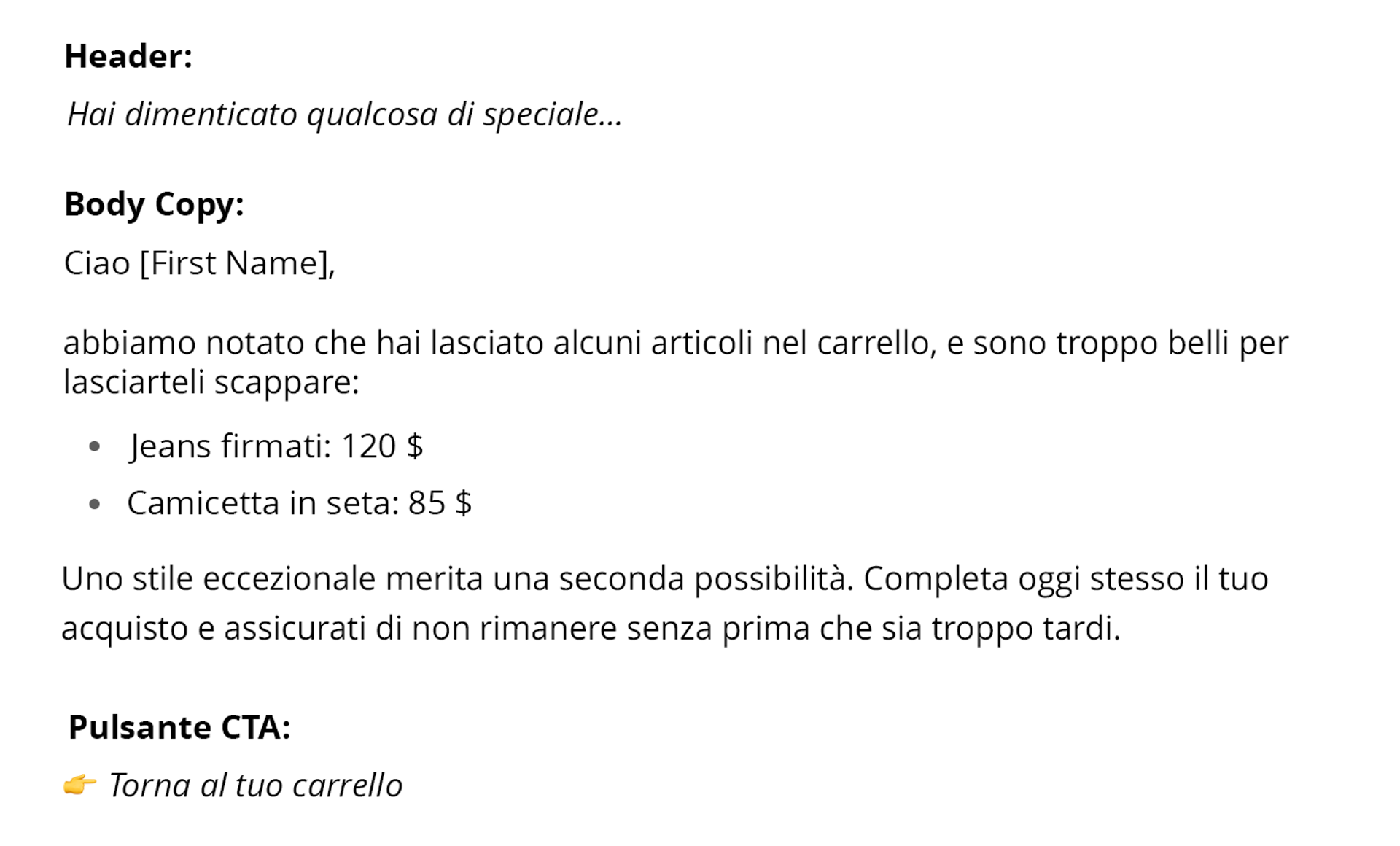 "Crea un modello email per carrello abbandonato per [tipo di attività] che vende [prodotti specifici]. Il cliente ha lasciato nel carrello [articoli specifici con i relativi prezzi]. L'email dovrebbe [indicazioni sul tono o sull'approccio]."