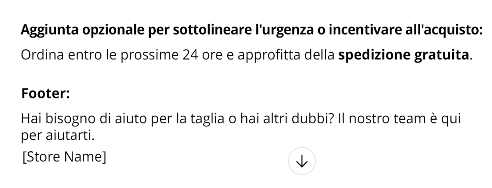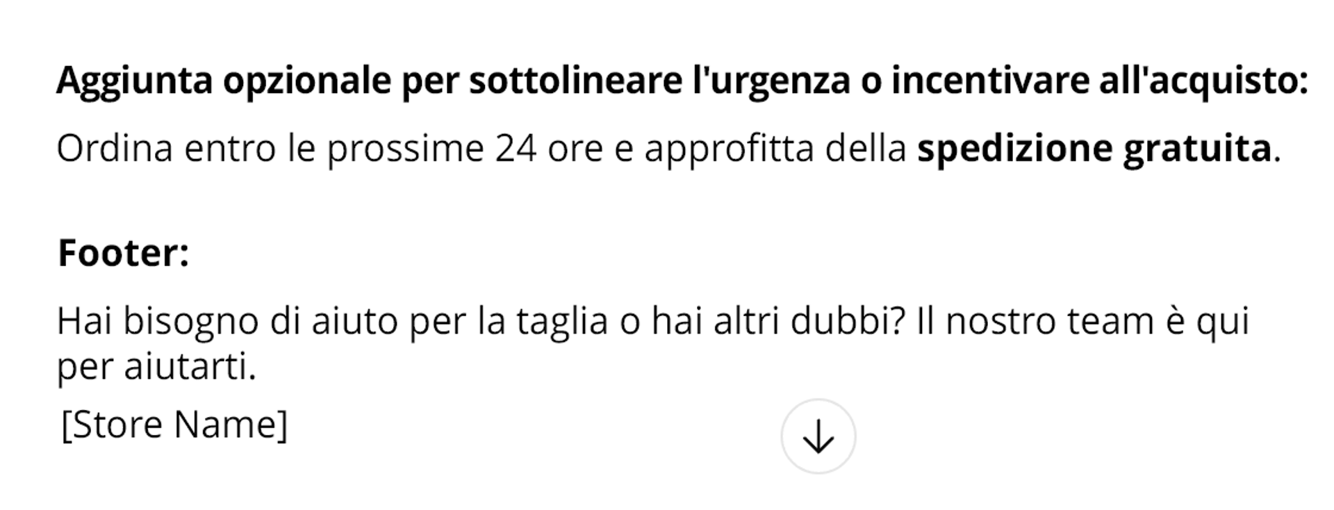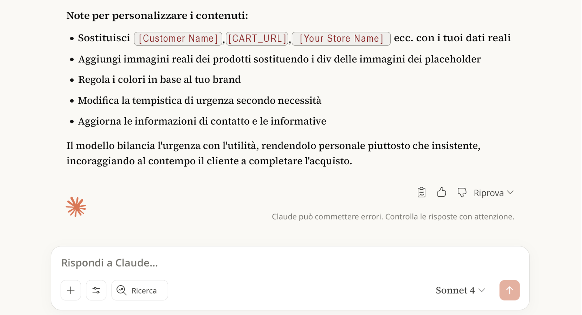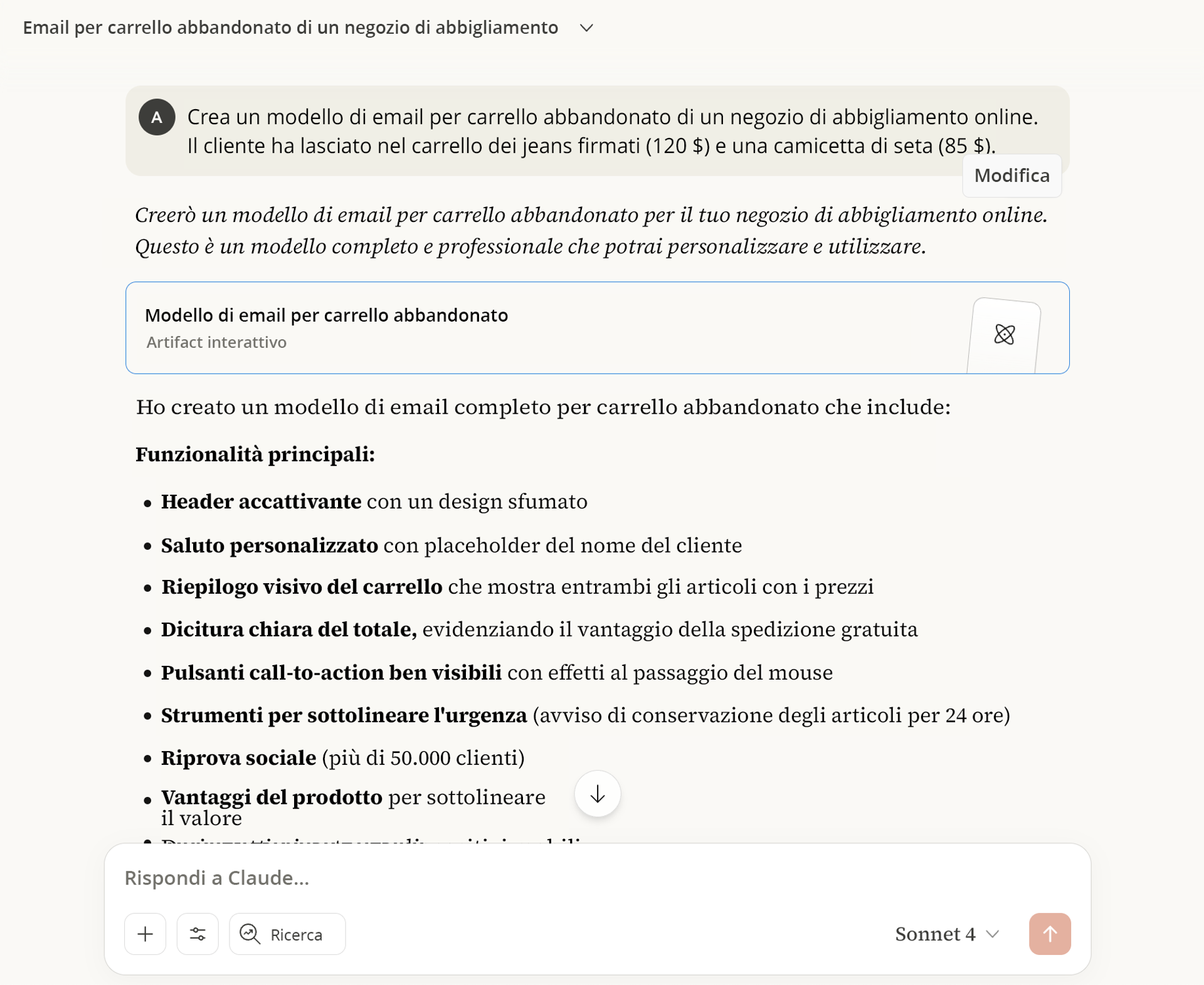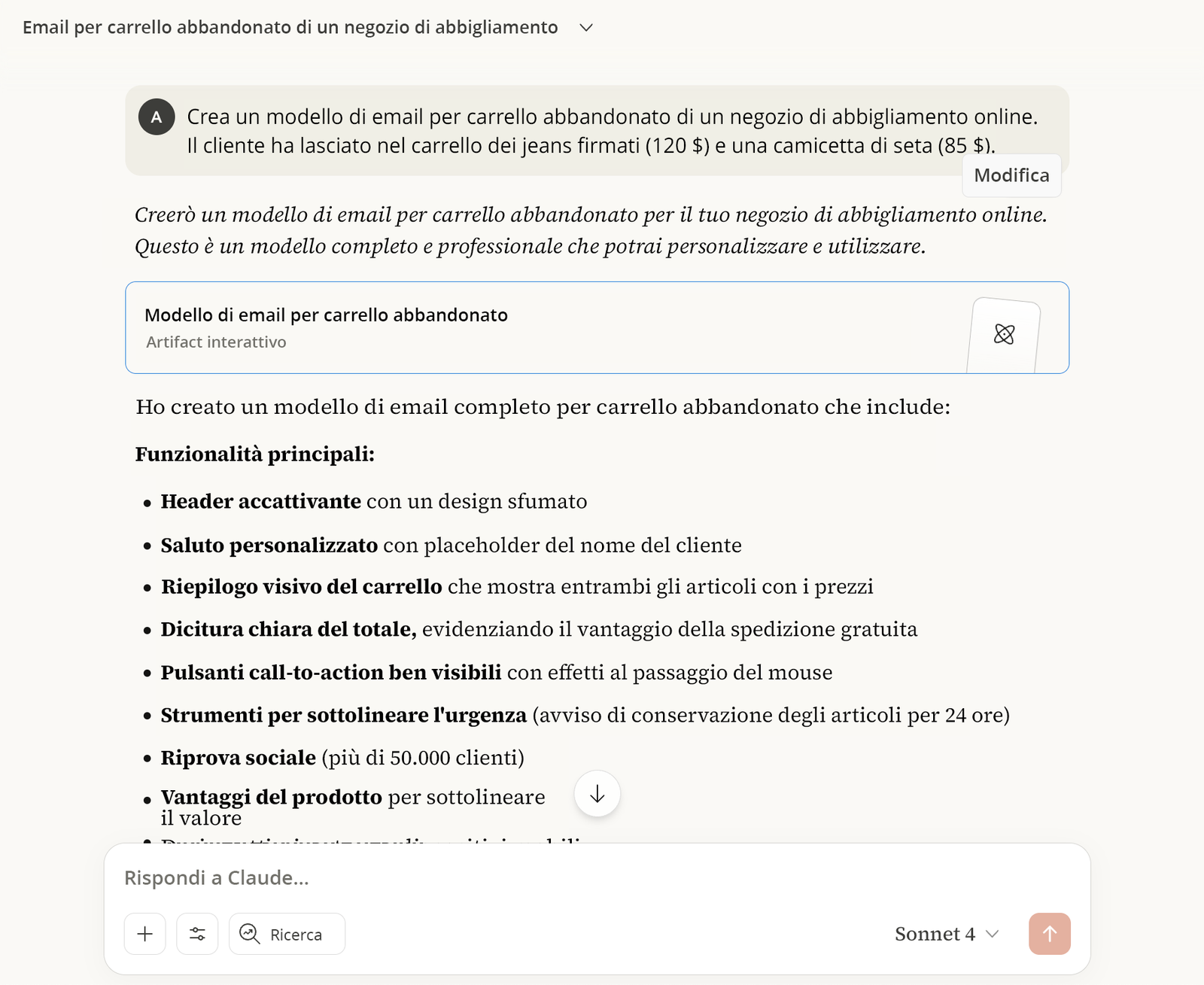 Inoltre, Claude ha inserito un elenco puntato che evidenzia cosa rende speciali i capi lasciati nel carrello, con una CTA finale che recita "Ottieni subito i miei articoli". Come abbiamo visto con ChatGPT, anche in questo caso si fa leva sulle classiche tattiche di urgenza tipiche delle email per carrelli abbandonati.