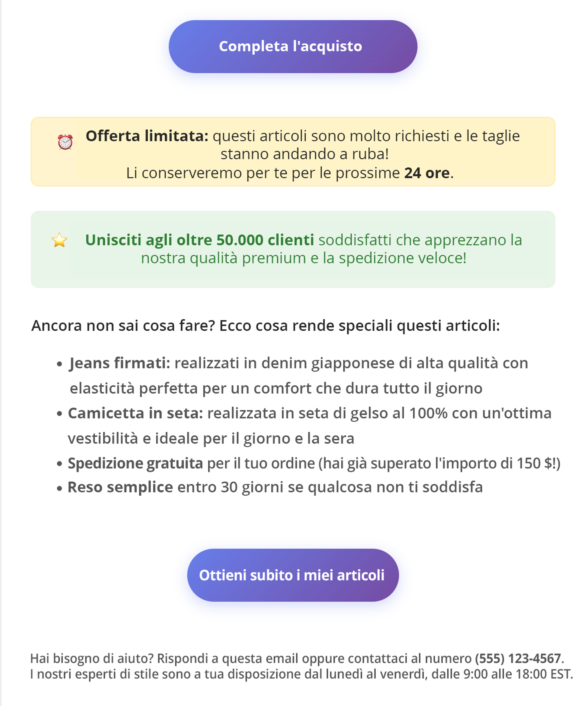L'approccio risultava familiare ma piuttosto generico, basato sul linguaggio standard dell'e-commerce e sulle classiche leve di urgenza. Il corpo dell'email includeva frasi come "Il grande stile merita una seconda occasione. Completa l'acquisto oggi stesso e rendili tuoi prima che vadano esauriti".