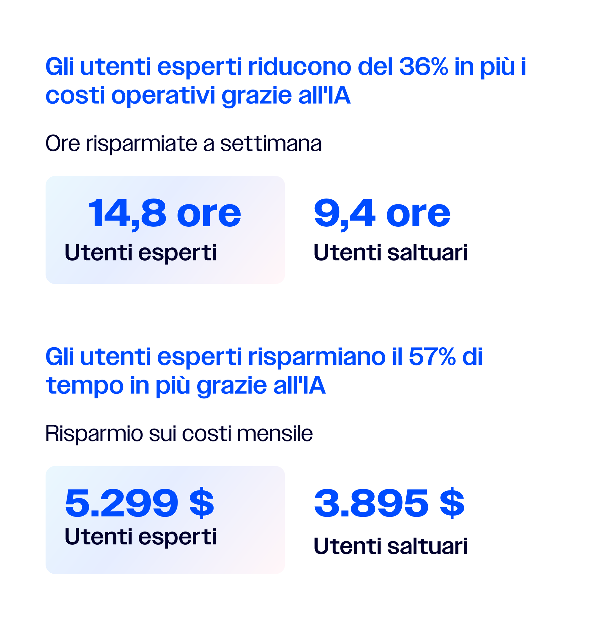E i vantaggi quasi raddoppiano per i Power Users (utenti che utilizzano l'IA ogni giorno). Risparmiano il 36 % in più sui costi operativi e il 57 % in più di tempo, semplicemente grazie all'uso dell'IA.