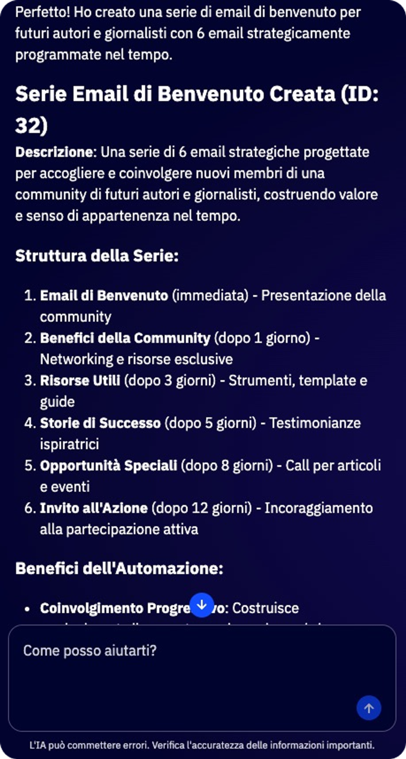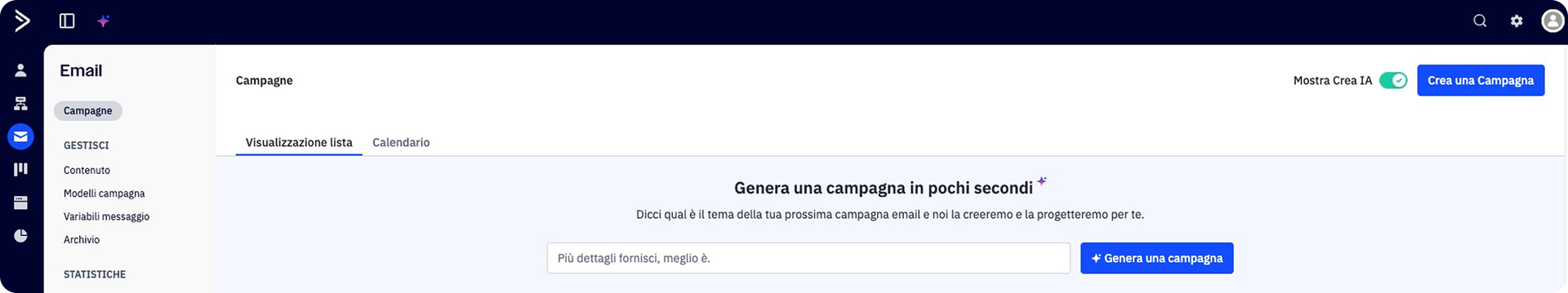 L'IA può creare campagne e contenuti più efficaci perché tiene conto dei tuoi obiettivi, analizza i dati dei tuoi clienti e genera modelli, messaggi e consigli su misura, migliorando il coinvolgimento e la pertinenza.