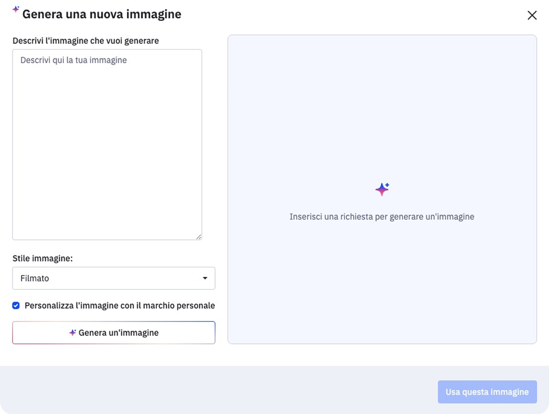 | 1. Scorrere manualmente la libreria dei modelli per trovare quello più simile alle proprie esigenze | 1. Definire gli obiettivi aziendali e i parametri del pubblico, importare il Brand Kit per mantenere la coerenza del brand |