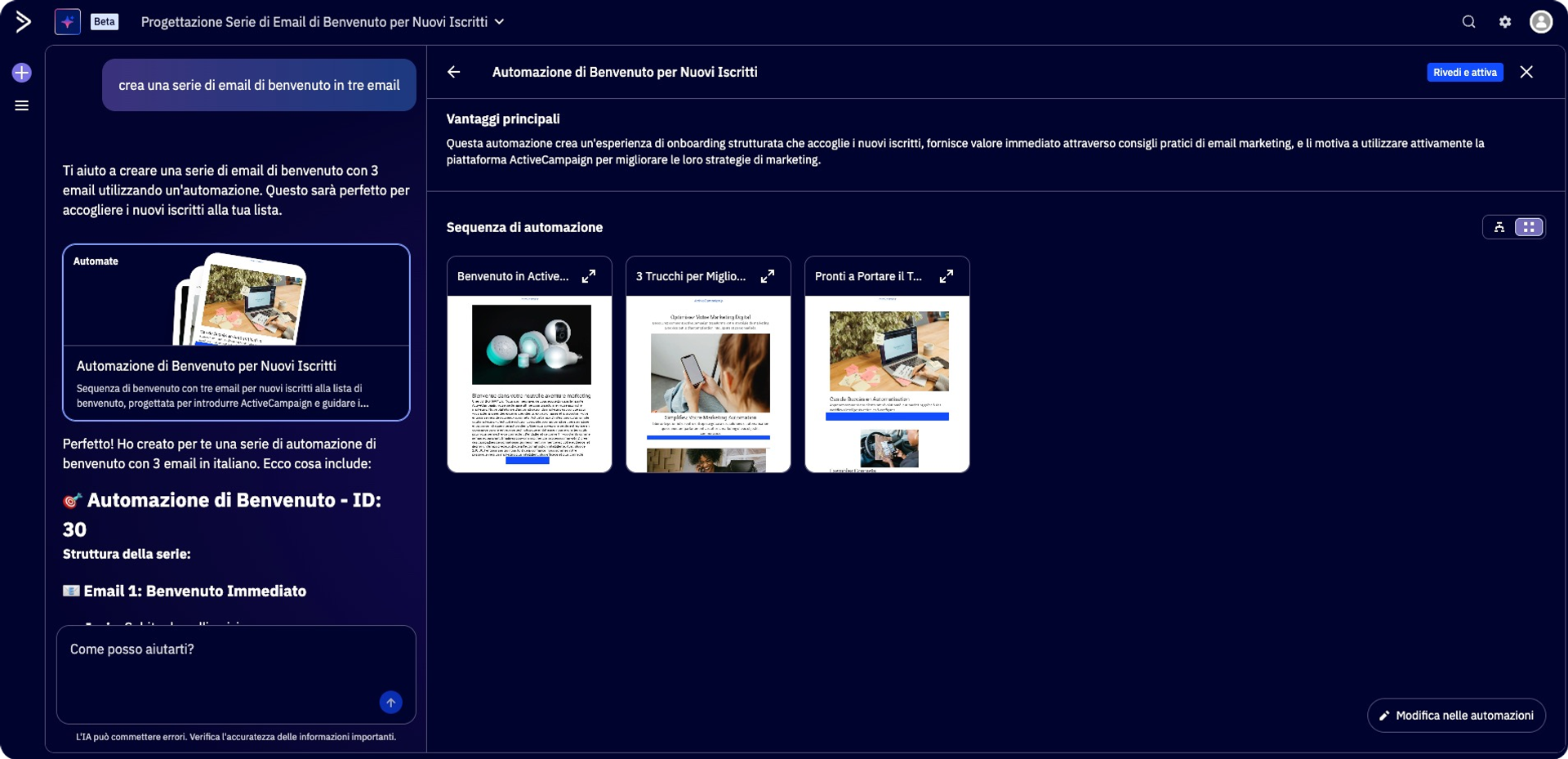 Creare una serie di benvenuto non deve essere complicato. Basta fornire un prompt ad Active Intelligence e l’intera sequenza viene generata in meno di un minuto.