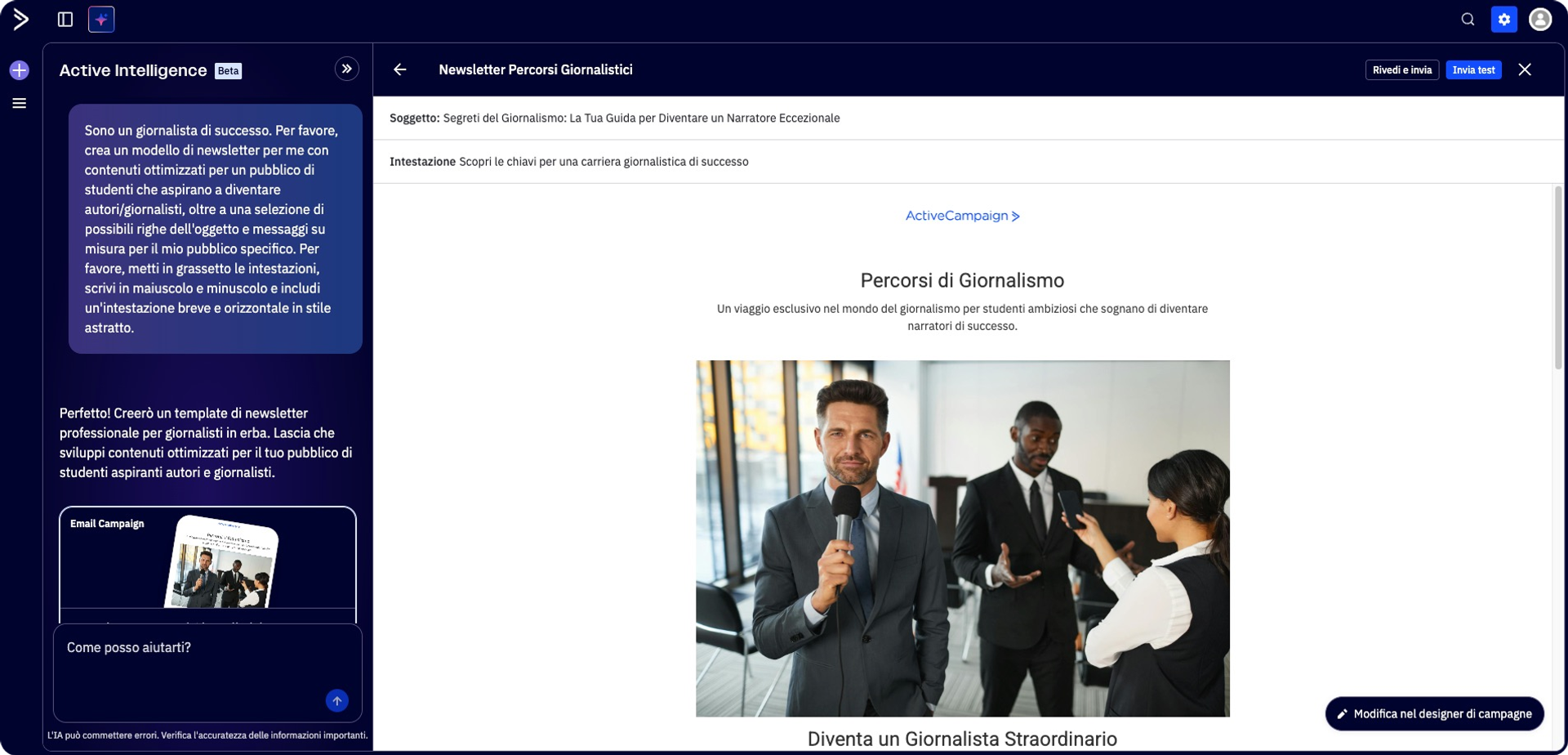 Fornendo a Active Intelligence un prompt personalizzato, la piattaforma si mette al lavoro e crea per te un modello di newsletter su misura, pensato per il tuo pubblico e per il tuo brand.
