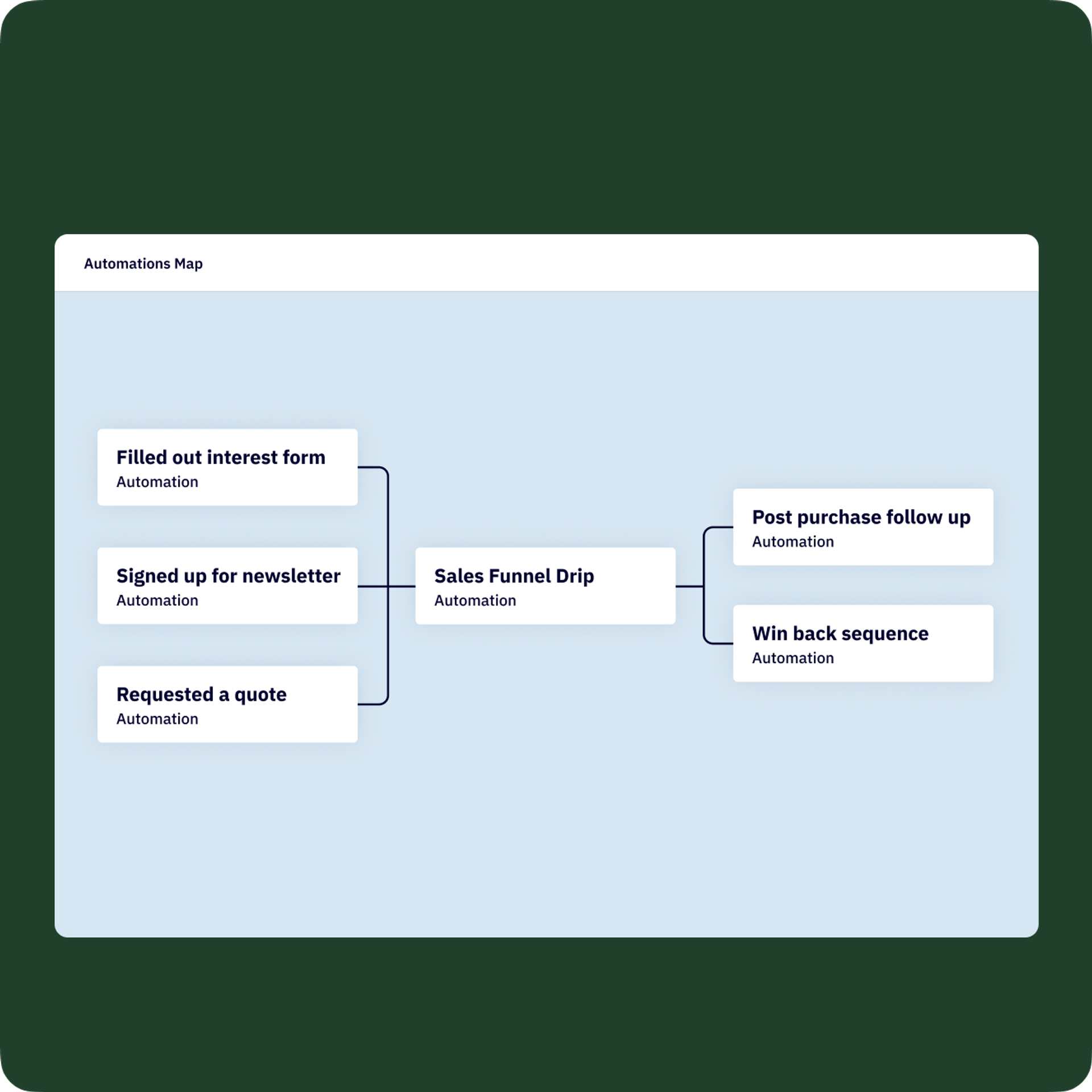 See how each of your automations are connected from one single view. Understand how they trigger, complete, and modify each other.