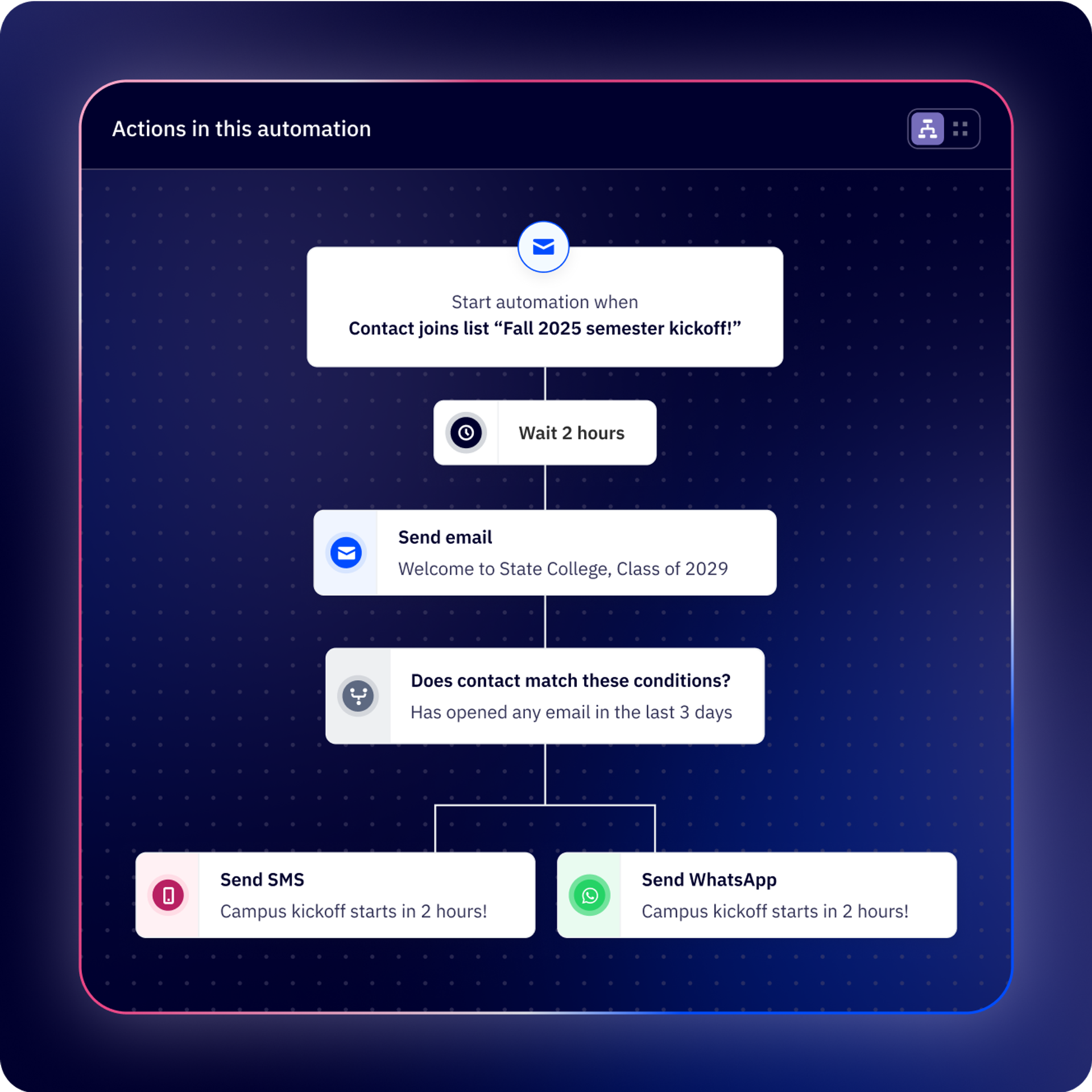 Create personalized journeys with split and conditional actions that automatically route contacts based on their behavior, preferences, and engagement—so every customer gets exactly what they need when they need it.
