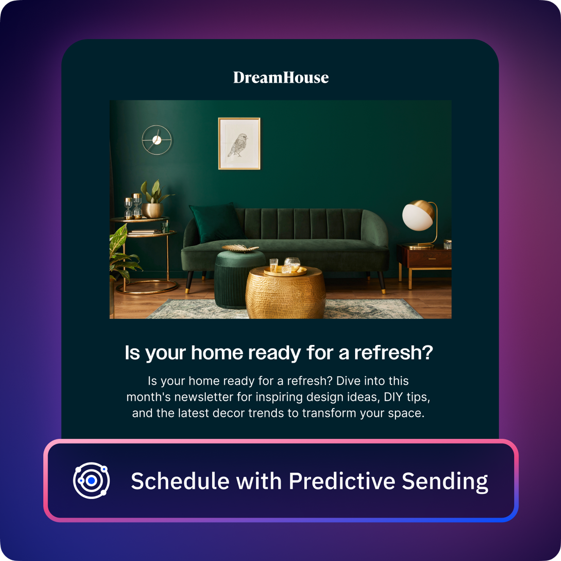 Powered by Active Intelligence, predictive sending is built to help you get more from each campaign. By using AI to analyze engagement patterns, predictive sending helps you optimize your send times for each person on your list. That means better email performance, more audience reach, and more opportunities to build your brand.