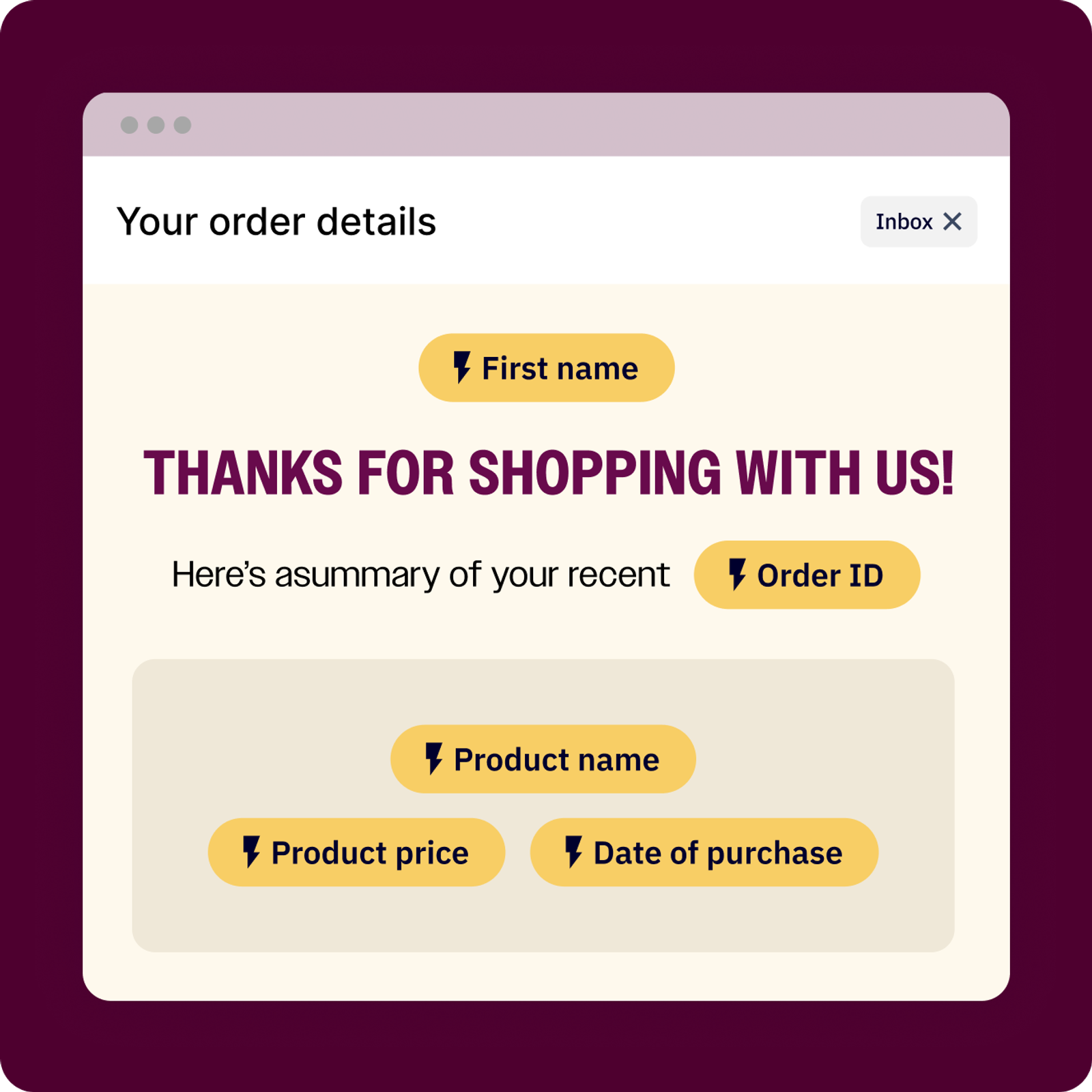 Every transactional email pulls in real-time data to stay relevant, accurate, and timely. Personalization happens automatically, so every message feels made for the moment.