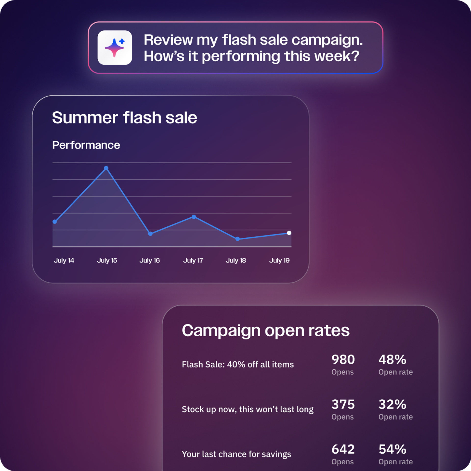 Ask about your marketing performance and get instant insights and feedback on how to improve. Need to know “how do my open rates compare to industry standards for retail?” or “what content changes can I make to improve my most recent email campaign?” Just ask.