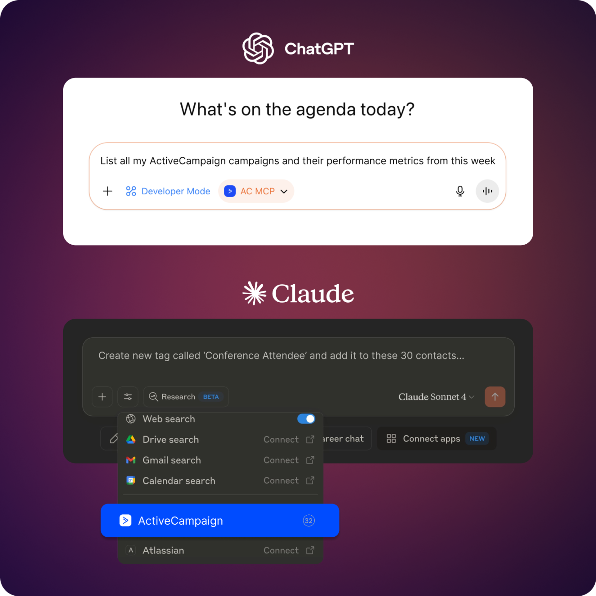 You can now securely connect your favorite AI tools (like Claude and ChatGPT) to your ActiveCampaign account. Manage contacts, analyze campaigns, and automate tasks through simple conversation with no coding or tab switching required. This connection is fueled by the ActiveCampaign MCP Server.