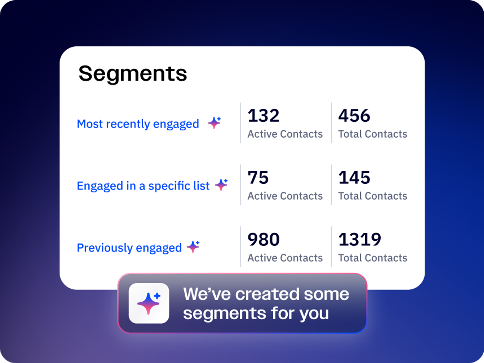 Discover valuable audience groups hiding in your data. AI scans your contacts to find patterns in behavior, engagement, and purchases—then recommends segments ready to use immediately. Uncover new people to target, try fresh audience ideas, and tap into revenue opportunities you didn't see before.