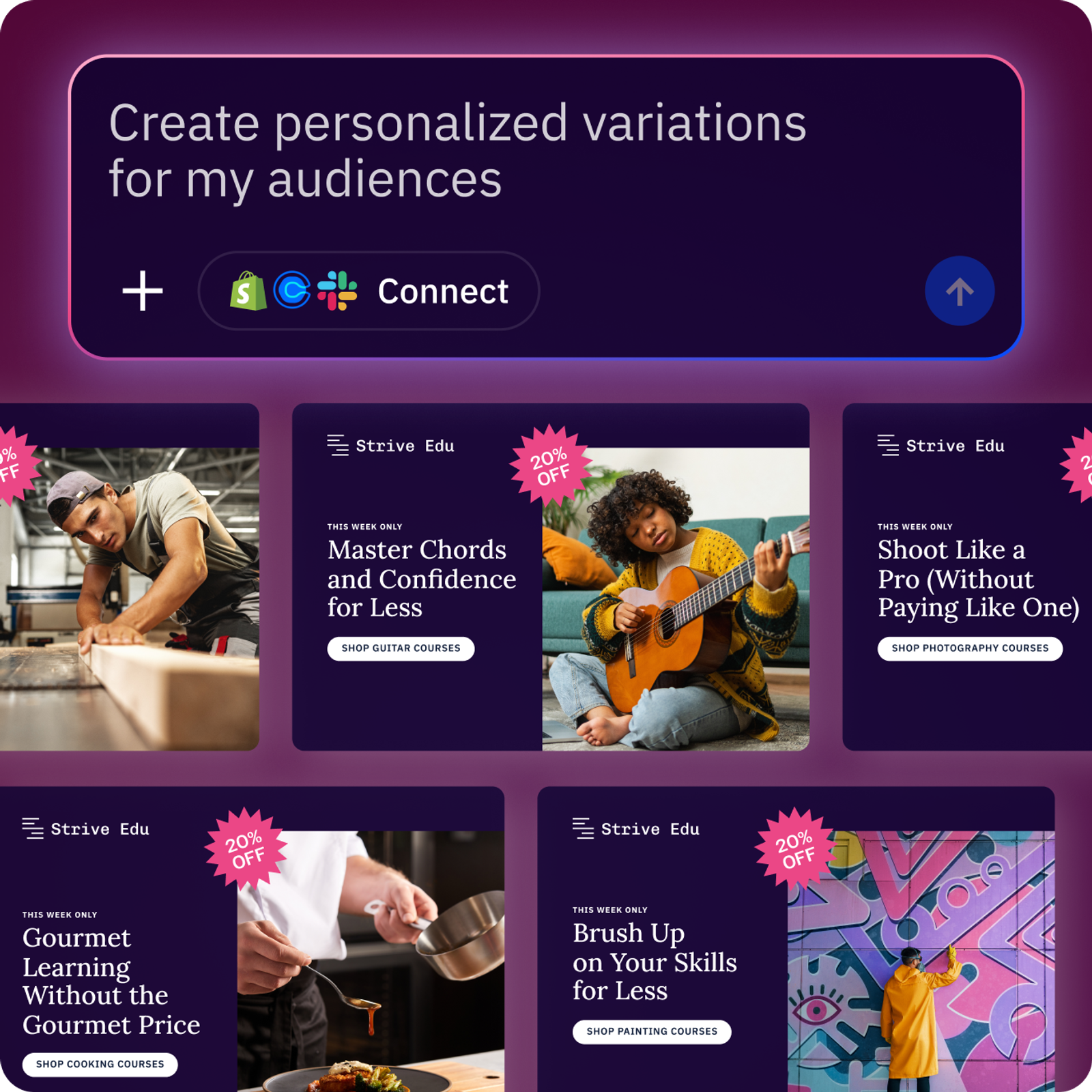 Swap out your images and videos for personalized options that’ll resonate for each contact. Shake things up based on region, purchase history, and more.